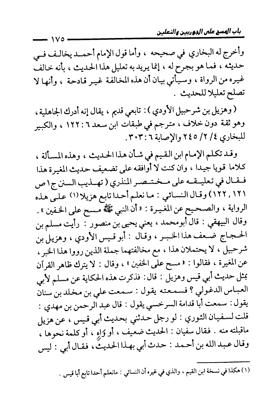 وقد تكلم الإمام ابن القيم في شأن هذا الحديث، وهذه المسألة، كلاما قويا جيدا، وإن كنت لا أوافقه على تضعيف حديث المغيرة هذا فقال في تعليقه على مختصر المنذري (تهذيب السنن ج 1 ص 121، 122) وقال النسائي: ما نعلم أحدا تابع هزيلا (¬1) على هذه الرواية، والصحيح عن المغيرة: "أن النبي - صلى الله عليه وسلم - مسح على الخفين". وقال البيهقي: قال أبو محمد، يعني يحيى بن منصور: رأيت مسلم بن الحجاج ضعف هذا الخبر، وقال: أبو قيس الأودي، وهزيل بن شرحبيل، لا يحتملان هذا، مع مخالفتهما جملة الذين رووا هذا الخبر، عن المغيرة، فقالوا: "مسح على الخفين"، وقال: لا يترك ظاهر القرآن بمثل حديث أبي قيس وهزيل: قال: فذكرت هذه الحكاية عن مسلم لأبي العباس الدغولي؟ فسمعته يقول: سمعت علي بن مخلد بن سنان يقول: سمعت أبا قدامة السرخسي يقول: قال عبد الرحمن بن مهدي: قلت لسفيان الثوري: لو رجل حدثني بحديث أبي قيس، عن هزيل ما قبلته منه. فقال سفيان: الحديث ضعيف، أو وَاهٍ أو كلمة نحوها، وقال عبد الله بن أحمد: حدث أبي بهذا الحديث، فقال أبي: ليس