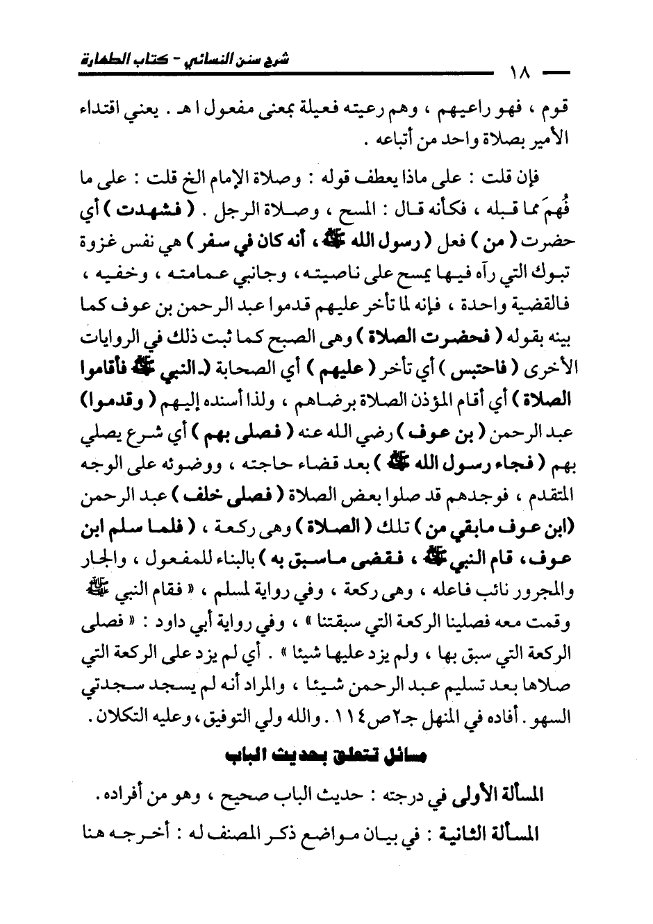 فإن قلت: على ماذا يعطف قوله: وصلاة الإمام الخ قلت: على ما فُهمَ مما قبله، فكأنه قال: المسح، وصلاة الرجل. (فشهدت) أي حضرت (من) فعل (رسول الله - صلى الله عليه وسلم -، أنه كان في سفر) هي نفس غزوة تبوك التي رآه فيها يمسح على ناصيته، وجانبي عمامته، وخفيه، فالقضية واحدة، فإنه لما تأخر عليهم قدموا عبد الرحمن بن عوف كما بينه بقوله (فحضرت الصلاة) وهي الصبح كما ثبت ذلك في الروايات الأخرى (فاحتبس) أي تأخر (عليهم) أي الصحابة (النبي - صلى الله عليه وسلم - فأقاموا الصلاة) أي أقام المؤذن الصلاة برضاهم، ولذا أسنده إليهم (وقدموا) عبد الرحمن (بن عوف) رضي الله عنه (فصلى بهم) أي شرع يصلي بهم (فجاء رسول الله - صلى الله عليه وسلم -) بعد قضاء حاجته، ووضوئه على الوجه المتقدم، فوجدهم قد صلوا بعض الصلاة (فصلى خلف) عبد الرحمن (ابن عوف ما بقي من) تلك (الصلاة) وهي ركعة، (فلما سلم ابن عوف، قام النبي - صلى الله عليه وسلم -، فقضى ما سبق به) بالبناء للمفعول، والجار والمجرور نائب فاعله، وهي ركعة، وفي رواية لمسلم، "فقام النبي - صلى الله عليه وسلم - وقمت معه فصلينا الركعة التي سبقتنا"، وفي رواية أبي داود: "فصلى الركعة التي سبق بها، ولم يزد عليها شيئا". أي لم يزد على الركعة التي صلاها بعد تسليم عبد الرحمن شيئا، والمراد أنه لم يسجد سجدتي السهو. أفاده في المنهل جـ 2 ص 114. والله ولي التوفيق، وعليه التكلان.