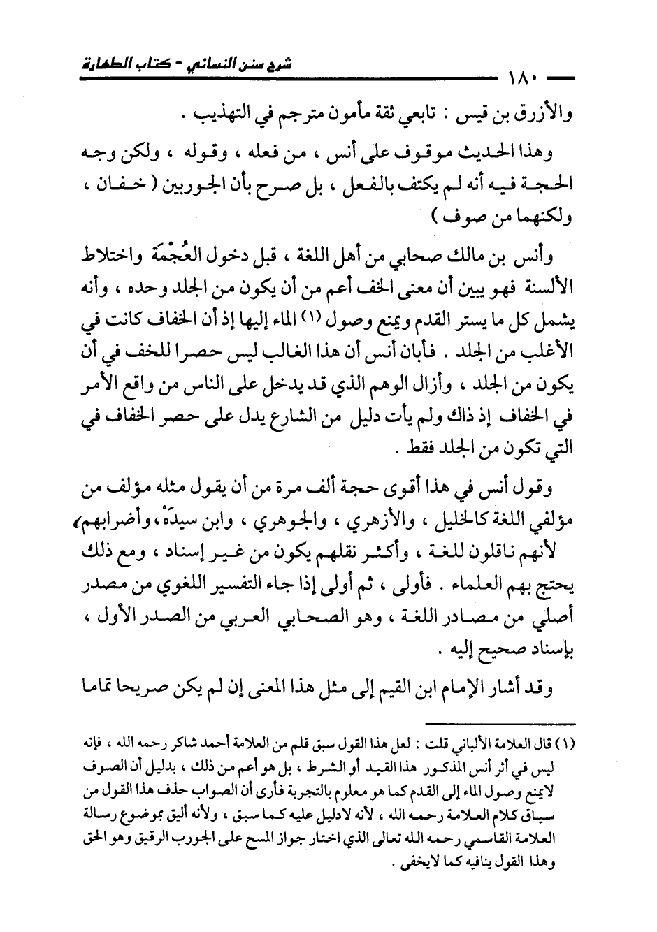 (¬1) قال العلامة الألباني قلت: لعل هذا القول سبق قلم من العلامة أحمد شاكر رحمه الله، فإنه ليس في أثر أنس المذكور هذا القيد أو الشرط، بل هو أعم من ذلك، بدليل أن الصوف لا يمنع وصول الماء إلى القدم كما هو معلوم بالتجربة فأرى أن الصواب حذف هذا القول من سياق كلام العلامة رحمه الله، لأنه لا دليل عليه كما سبق، ولانه أليق بموضرع رسالة العلامة القاسمي رحمه الله تعالى الذي اختار جواز المسح على الجورب الرقيق وهو الحق وهذا القول ينافيه كما لا يخفى.
