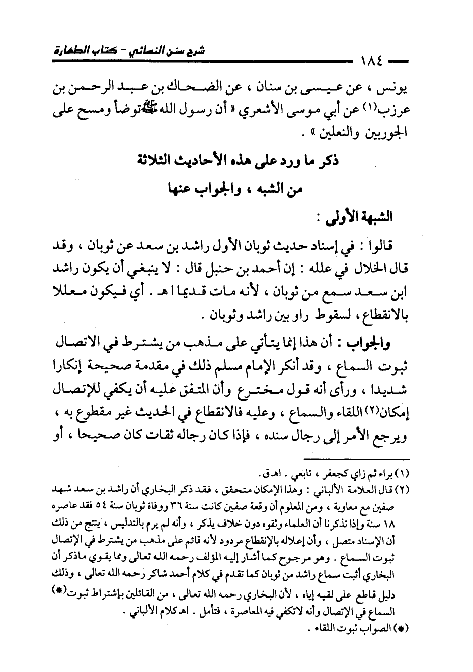 (¬2) قال العلامة الألباني: وهذا الإمكان متحقق، فقد ذكر البخاري أن راشد بن سعد شهد صفين مع معاوية، ومن المعلوم أن وقعة صفين كانت سنة 36 ووفاة ثوبان سنة 54 فقد عاصره 18 سنة وإذا تذكرنا أن العلماء وثقوه دون خلاف يذكر، وأنه لم يرم بالتدليس، ينتج من ذلك أن الإسناد متصل، وأن إعلاله بالإنقطاع مردود لأنه قائم على مذهب من يشترط في الإتصال ثبوت السماع. وهو مرجوح كما أشار إليه المؤلف رحمه الله تعالى ومما يقوي ما ذكر أن البخاري أثبت سماع راشد من ثوبان كما تقدم في كلام أحمد شاكر رحمه الله تعالى، وذلك دليل قاطع على لقيه إياه؛ لأن البخاري رحمه الله تعالى، من القائلين بإشتراط ثبوت (*) السماع في الإتصال وأنه لا تكفي فيه المعاصرة، فتأمل. اهـ كلام الألباني.