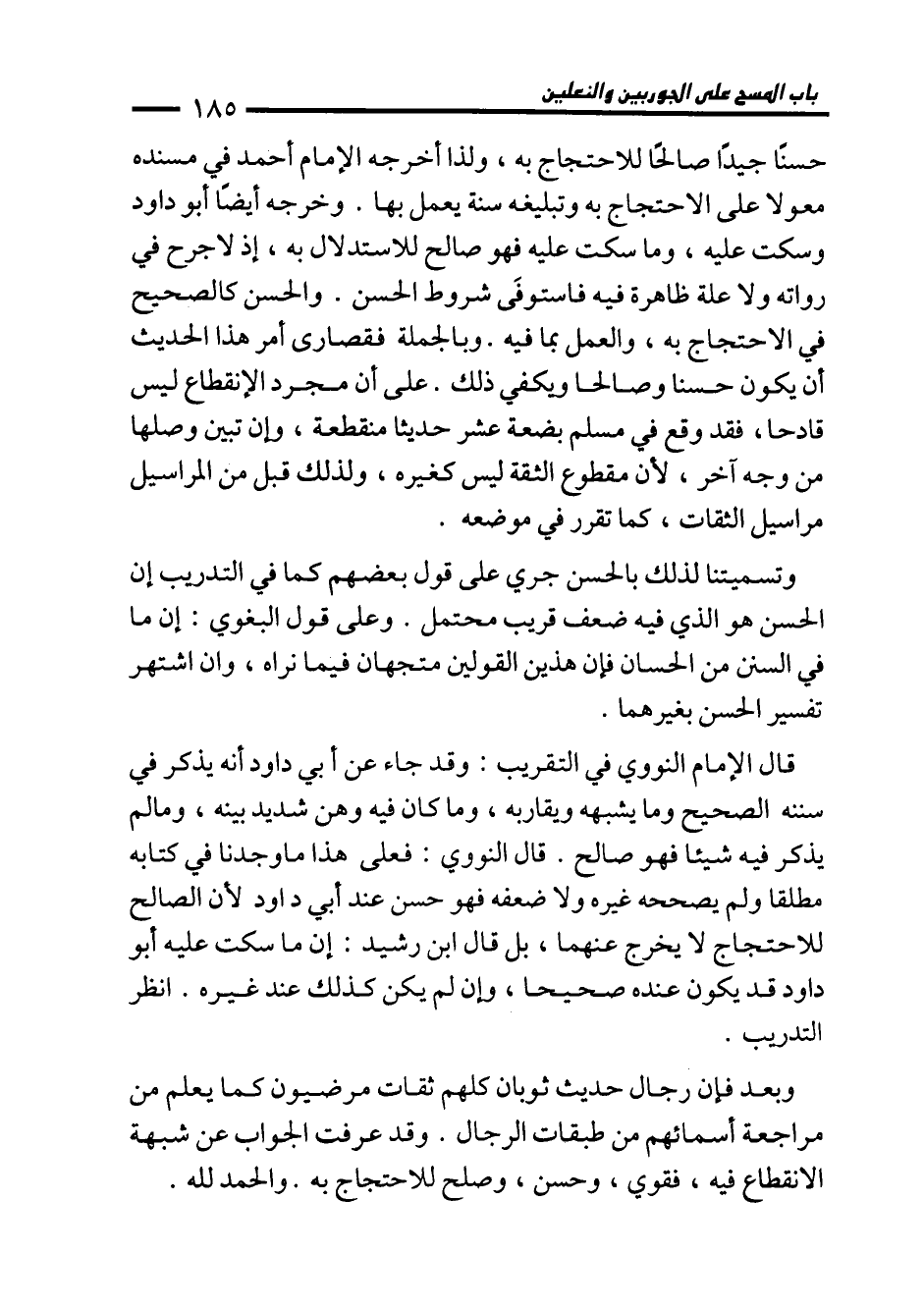 وتسميتنا لذلك بالحسن جري على قول بعضهم كما في التدريب إن الحسن هو الذي فيه ضعف قريب محتمل. وعلى قول البغوي: إن ما في السنن من الحسان فإن هذين القولين متجهان فيما نراه، وإن اشتهر تفسير الحسن بغيرهما.