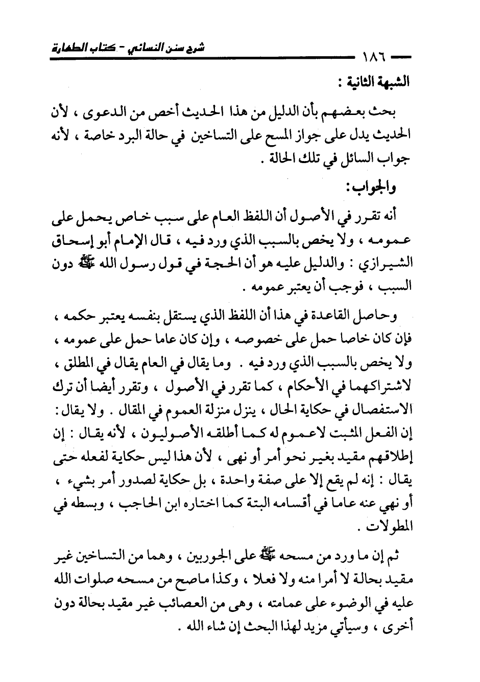 ثم إن ما ورد من مسحه - صلى الله عليه وسلم - على الجوربين، وهما من التساخين غير مقيد بحالة لا أمرا منه ولا فعلا، وكذا ما صح من مسحه صلوات الله عليه في الوضوء على عمامته، وهي من العصائب غير مقيد بحالة دون أخرى، وسيأتي مزيد لهذا البحث إن شاء الله.