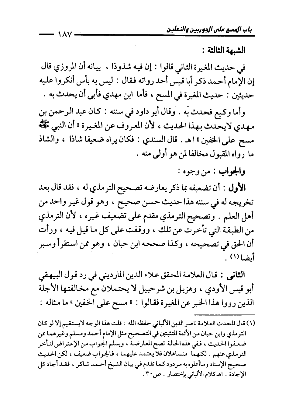 الثاني: قال العلامة المحقق علاء الدين المارديني في رد قول البيهقي أبو قيس الأودي، وهزيل بن شرحبيل لا يحتملان مع مخالفتها الأجلة الذين رووا هذا الخبر عن المغيرة فقالوا: "مسح على الخفين" ما مثاله: