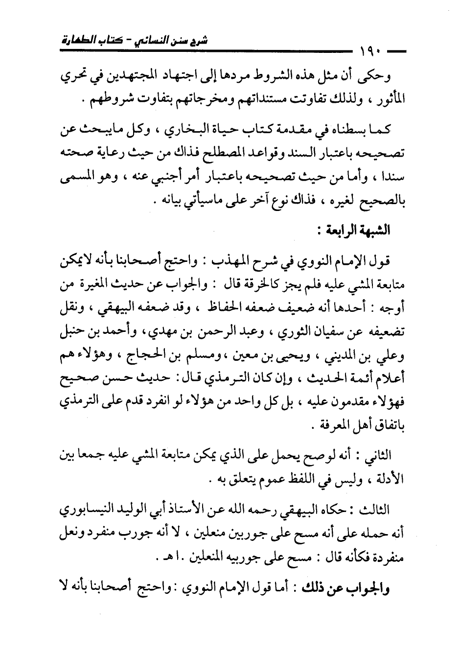 قول الإمام النووي في شرح المهذب: واحتج أصحابنا بأنه لا يمكن متابعة المشي عليه فلم يجز كالخرقة قال: والجواب عن حديث المغيرة من أوجه: أحدها أنه ضعيف ضعفه الحفاظ، وقد ضعفه البيهقي، ونقل تضعيفه عن سفيان الثوري، وعبد الرحمن بن مهدي، وأحمد بن حنبل وعلي بن المديني، ويحيى بن معين، ومسلم بن الحجاج، وهؤلاء هم أعلام أئمة الحديث، وإن كان الترمذي قال: حديث حسن صحيح فهؤلاء مقدمون عليه، بل كل واحد من هؤلاء لو انفرد قدم على الترمذي باتفاق أهل المعرفة.