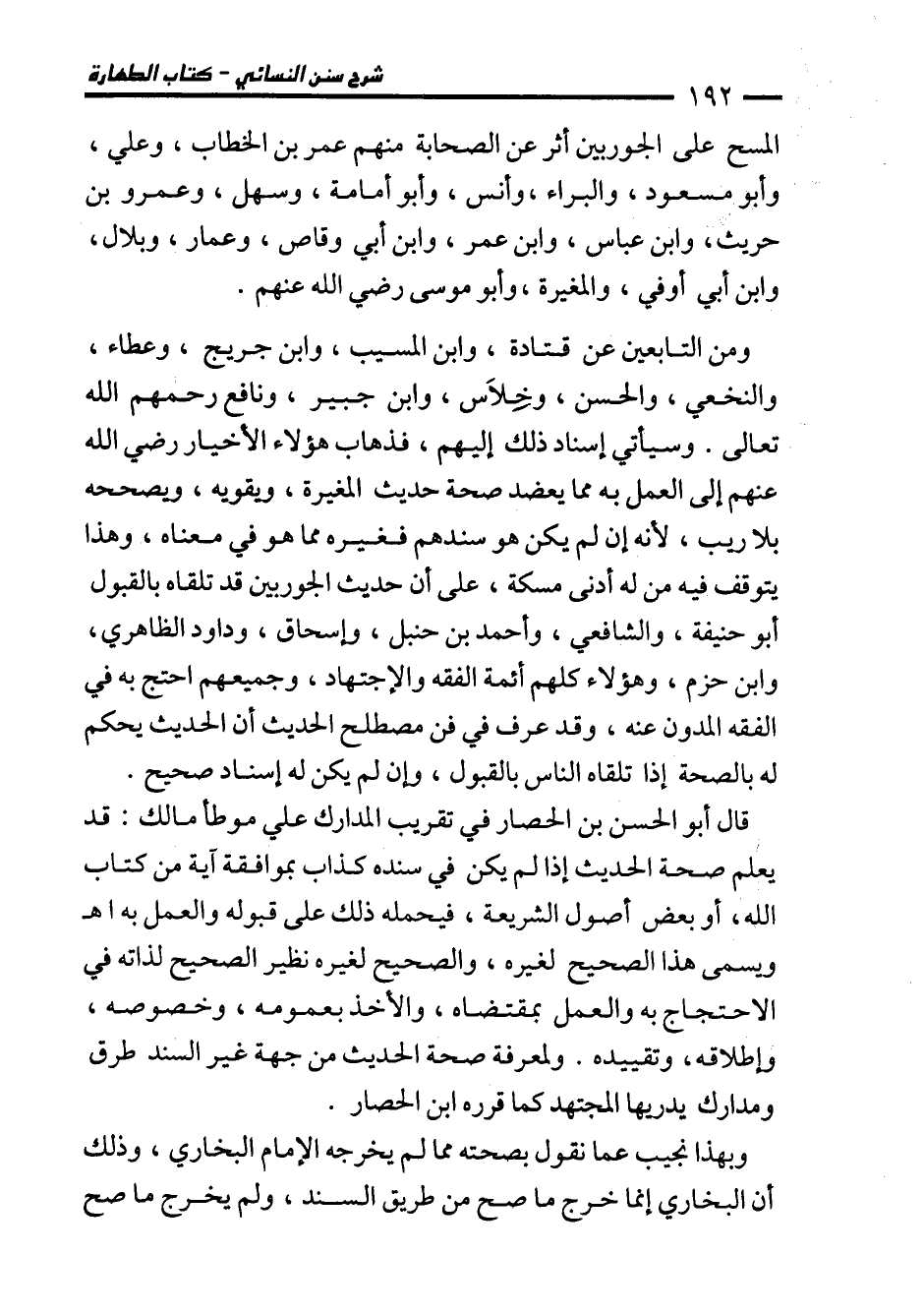 ومن التابعين عن قتادة، وابن المسيب، وابن جريج، وعطاء، والنخعي، والحسن، وخِلاَس، وابن جبير، ونافع رحمهم الله تعالى. وسيأتي إسناد ذلك إليهم، فذهاب هؤلاء الأخيار رضي الله عنهم إلى العمل به مما يعضد صحة حديث المغيرة، ويقويه، ويصححه بلا ريب؛ لأنه إن لم يكن هو سندهم فغيره مما هو في معناه، وهذا يتوقف فيه من له أدنى مسكة، على أن حديث الجوربين قد تلقاه بالقبول أبو حنيفة، والشافعي، وأحمد بن حنبل، وإسحاق، وداود الظاهري، وابن حزم، وهؤلاء كلهم أئمة الفقه والإجتهاد، وجميعهم احتج به في الفقه المدون عنه، وقد عرف في فن مصطلح الحديث أن الحديث يحكم له بالصحة إذا تلقاه الناس بالقبول، وإن لم يكن له إسناد صحيح.