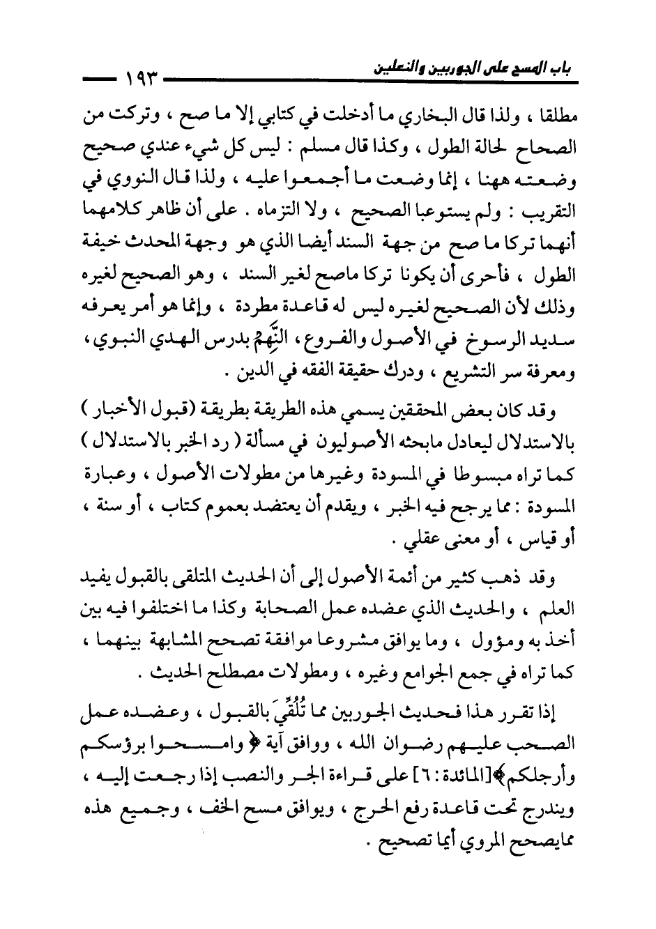إذا تقرر هذا فحديث الجوربين مما تُلُقِّيَ بالقبول، وعضده عمل الصحب عليهم رضوان الله، ووافق آية {وَامْسَحُوا بِرُءُوسِكُمْ وَأَرْجُلَكُمْ} [المائدة: 6] على قراءة الجر والنصب إذا رجعت إليه، ويندرج تحت قاعدة رفع الحرج، ويوافق مسح الخف، وجميع هذه مما يصحح المروي أيما تصحيح.