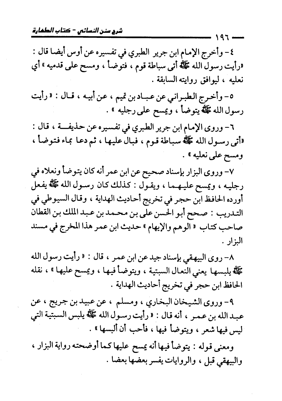 8 - روى البيهقي بإسناد جيد عن ابن عمر، قال: "رأيت رسول الله - صلى الله عليه وسلم - يلبسها يعني النعال السبتية، ويتوضأ فيها، ويمسح عليها"، نقله الحافظ ابن حجر في تخريج أحاديث الهداية.