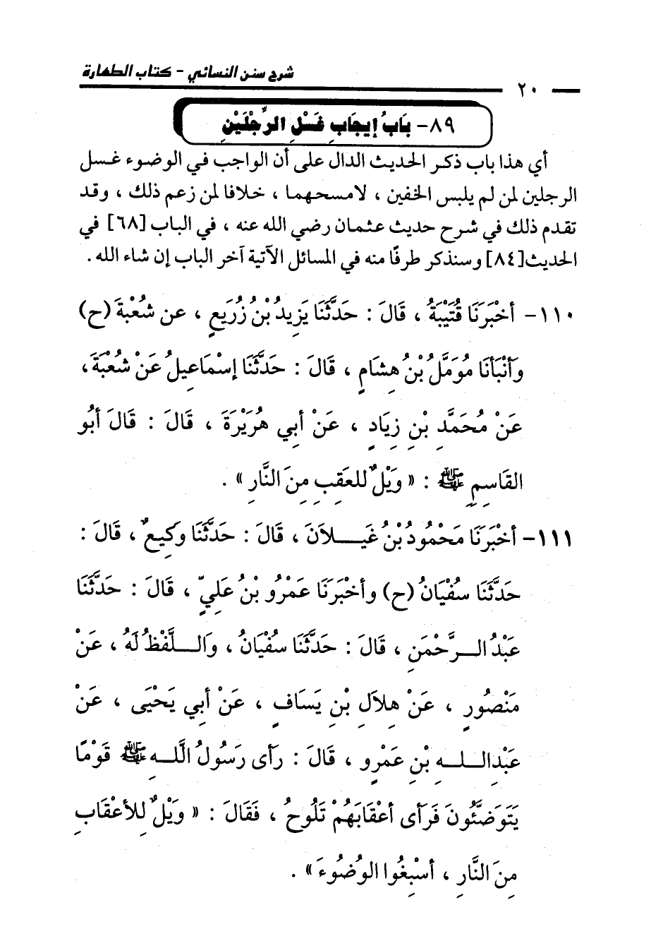 110 - أَخْبَرَنَا قُتَيْبَةُ، قَالَ: حَدَّثَنَا يَزِيدُ بْنُ زُرَيْعٍ، عَنْ شُعْبَةَ (ح) وَأَنْبَأَنَا مُؤَمَّلُ بْنُ هِشَامٍ، قَالَ: حَدَّثَنَا إِسْمَاعِيلُ عَنْ شُعْبَةَ، عَنْ مُحَمَّدِ بْنِ زِيَادٍ، عَنْ أَبِي هُرَيْرَةَ، قَالَ: قَالَ أَبُو الْقَاسِمِ - صلى الله عليه وسلم -: "وَيْلٌ لِلْعَقِبِ مِنَ النَّارِ".