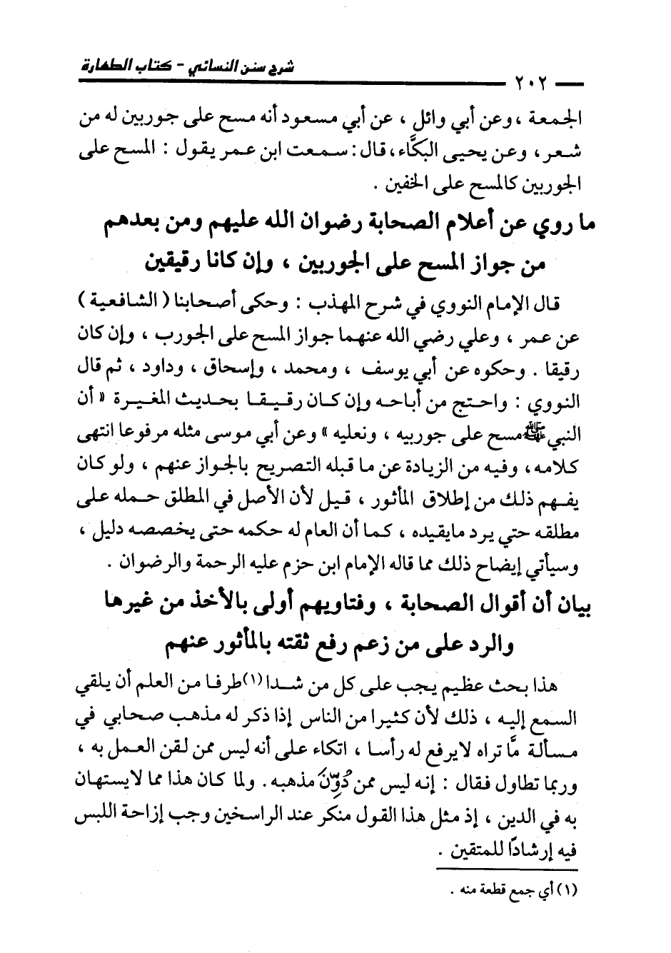 قال الإمام النووي في شرح المهذب: وحكى أصحابنا (الشافعية) عن عمر، وعلي رضي الله عنهما جواز المسح على الجورب، وإن كان رقيقا. وحكوه عن أبي يوسف، ومحمد، وإسحاق، وداود، ثم قال النووي: واحتج من أباحه وإن كان رقيقا بحديث المغيرة "أن النبي - صلى الله عليه وسلم - مسح على جوربيه، ونعليه" وعن أبي موسى مثله مرفوعا انتهى كلامه، وفيه من الزيادة عن ما قبله التصريح بالجواز عنهم، ولو كان يفهم ذلك من إطلاق المأثور، قيل لأن الأصل في المطلق حمله على