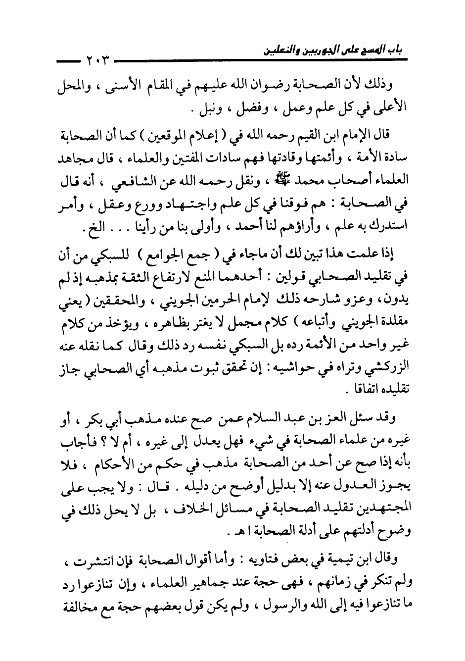 وقد سئل العز بن عبد السلام عمن صح عنده مذهب أبي بكر، أو غيره من علماء الصحابة في شيء فهل يعدل إلى غيره، أم لا؟ فأجاب بأنه إذا صح عن أحد من الصحابة مذهب في حكم من الأحكام، فلا يجوز العدول عنه إلا بدليل أوضح من دليله. قال: ولا يجب على المجتهدين تقليد الصحابة في مسائل الخلاف، بل لا يحل ذلك في وضوح أدلتهم على أدلة الصحابة اهـ.