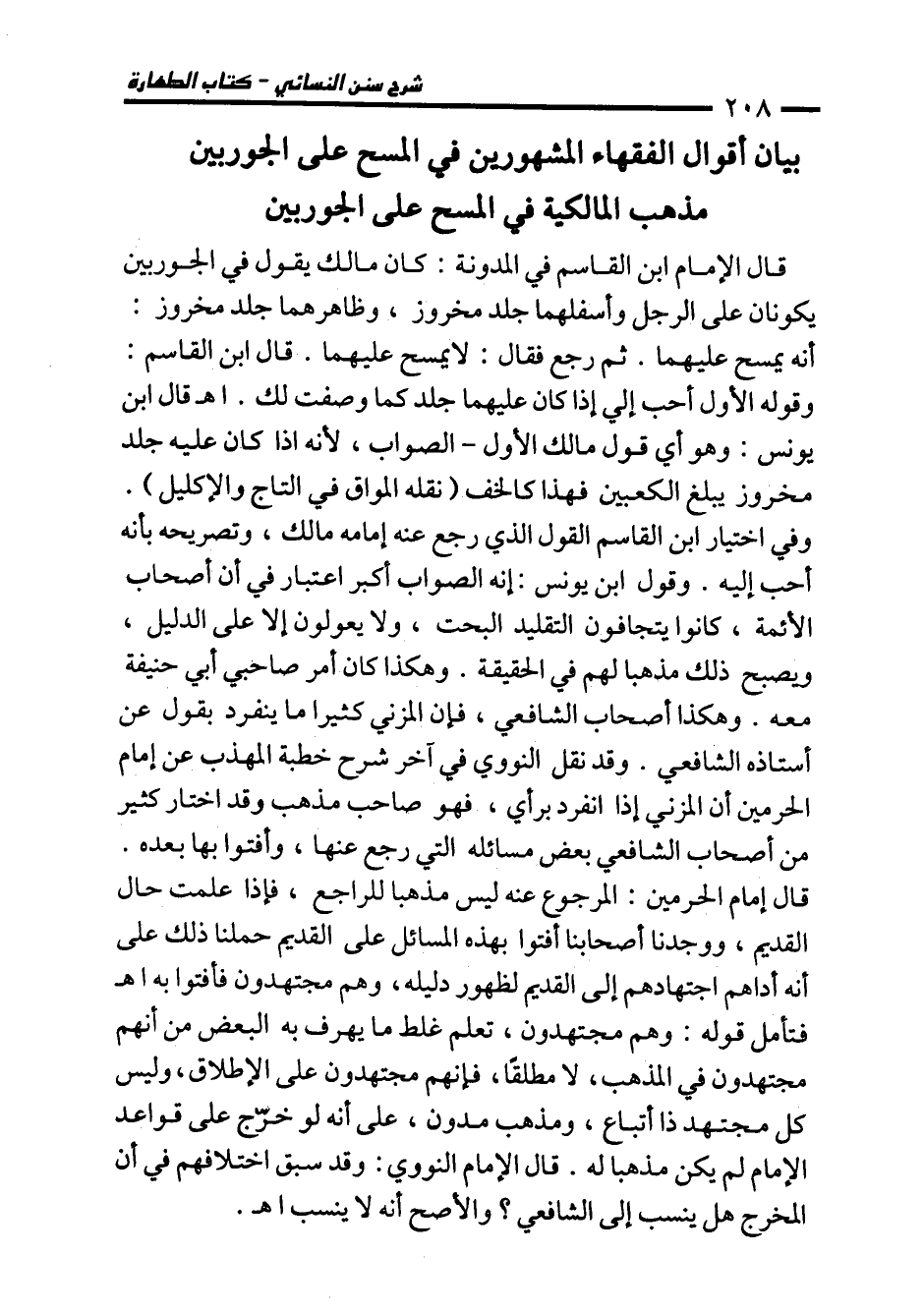 قال الإمام ابن القاسم في المدونة: كان مالك يقول في الجوربين يكونان على الرجل وأسفلهما جلد مخروز، وظاهرهما جلد مخروز: أنه يمسح عليهما. ثم رجع فقال: لا يمسح عليهما. قال ابن القاسم: وقوله الأول أحب إلى إذا كان عليهما جلد كما وصفت لك. اهـ قال ابن يونس: وهو أي قول مالك الأول- الصواب؛ لأنه إذا كان عليه جلد مخروز يبلغ الكعبين فهذا كالخف (نقله المواق في التاج والإكليل). وفي اختيار ابن القاسم القول الذي رجع عنه إمامه مالك، وتصريحه بأنه أحب إليه. وقول ابن يونس: إنه الصواب أكبر اعتبار في أن أصحاب الأئمة، كانوا يتجافون التقليد البحت، ولا يعولون إلا على الدليل، ويصبح ذلك مذهبا لهم في الحقيقة. وهكذا كان أمر صاحبي أبي حنيفة معه. وهكذا أصحاب الشافعي، فإن المزني كثيرا ما ينفرد بقول عن أستاذه الشافعي. وقد نقل النووي في آخر شرح خطبة المهذب عن إمام الحرمين أن المزني إذا انفرد برأي، فهو صاحب مذهب وقد اختار كثير من أصحاب الشافعي بعض مسائله التي رجع عنها، وأفتوا بها بعده. قال إمام الحرمين: المرجوع عنه ليس مذهبا للراجع، فإذا علمت حال القديم، ووجدنا أصحابنا أفتوا بهذه المسائل على القديم حملنا ذلك على أنه أداهم اجتهادهم إلى القديم لظهور دليله، وهم مجتهدون فأفتوا به اهـ فتأمل قوله: وهم مجتهدون، تعلم غلط ما يهرف به البعض من أنهم مجتهدون في المذهب، لا مطلقًا، فإنهم مجتهدون على الإطلاق، وليس كل مجتهد ذا أتباع، ومذهب مدون، على أنه لو خرج على قواعد الإمام لم يكن مذهبا له. قال الإمام النووي: وقد سبق اختلافهم في أن المخرج هل ينسب إلى الشافعي؟ والأصح أنه لا ينسب اهـ.