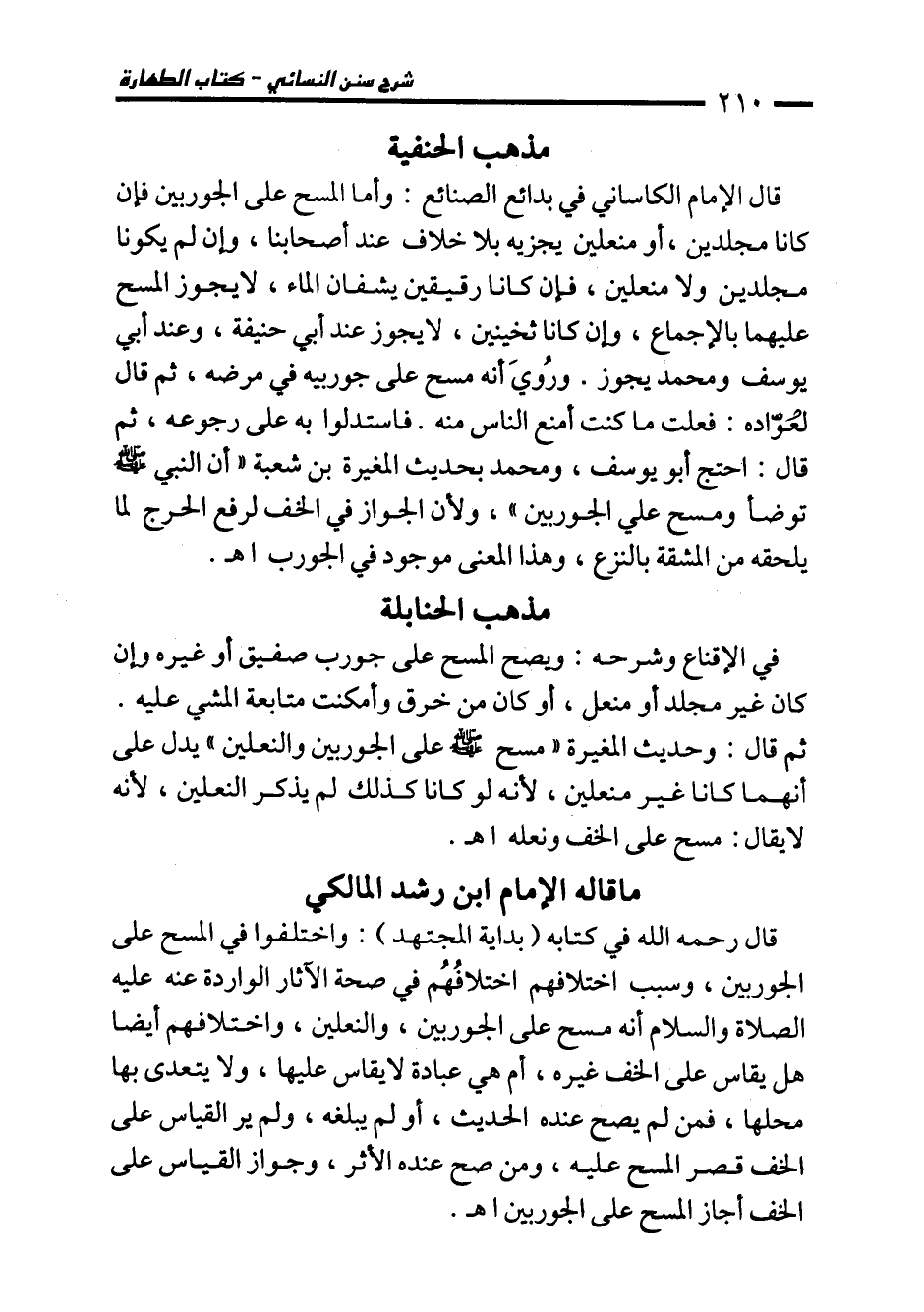 قال رحمه الله في كتابه (بداية المجتهد): واختلفوا في المسح على الجوربين، وسبب اختلافهم اختلافُهُم في صحة الآثار الواردة عنه عليه الصلاة والسلام أنه مسح على الجوربين، والنعلين، واختلافهم أيضا هل يقاس على الخف غيره، أم هي عبادة لا يقاس عليها، ولا يتعدى بها محلها، فمن لم يصح عنده الحديث، أو لم يبلغه، ولم ير القياس على الخف قصر المسح عليه، ومن صح عنده الأثر، وجواز القياس على الخف أجاز المسح على الجوربين اهـ.