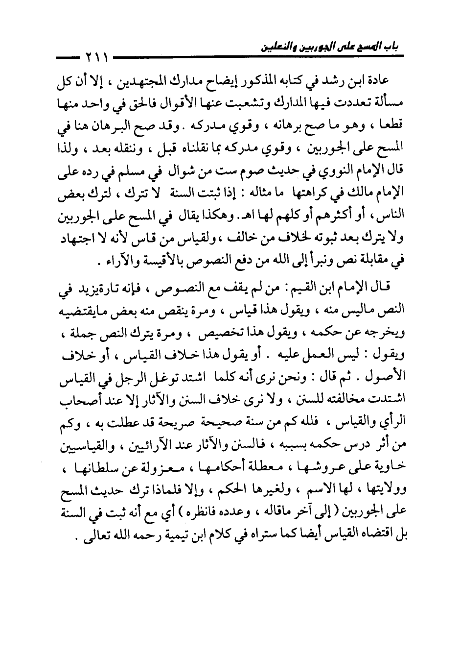 عادة ابن رشد في كتابه المذكور إيضاح مدارك المجتهدين، إلا أن كل مسألة تعددت فيها الدارك وتشعبت عنها الأقوال فالحق في واحد منها قطعا، وهو ما صح برهانه، وقوي مدركه. وقد صح البرهان هنا في المسح على الجوربين، وقوي مدركه بما نقلناه قبل، وننقله بعد، ولذا قال الإمام النووي في حديث صوم ست من شوال في مسلم في رده على الإمام مالك في كراهتها ما مثاله: إذا ثبتت السنة تترك، لترك بعض الناس، أو أكثرهم أو كلهم لها اهـ. وهكذا يقال في المسح على الجوربين ولا يترك بعد ثبوته لخلاف من خالف، ولقياس من قاس لأنه لا اجتهاد في مقابلة نص ونبرأ إلى الله من دفع النصوص بالأقيسة والآراء.
