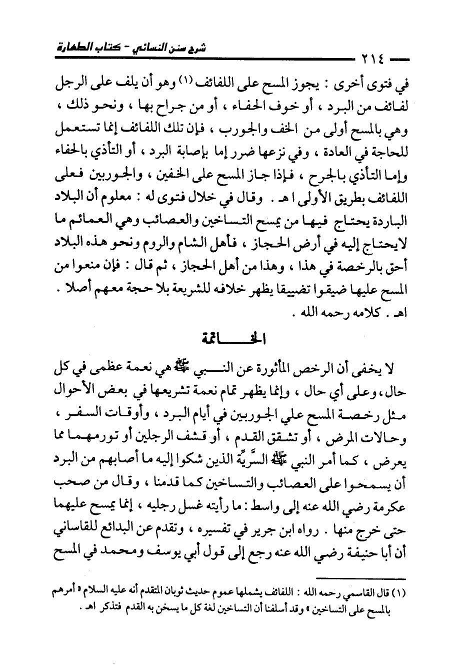 (¬1) قال القاسمي رحمه الله: اللفائف يشملها عموم حديث ثوبان المتقدم أنه عليه السلام "أمرهم بالمسح على التساخين" وقد أسلفنا أن التساخين لغة كل ما يسخن به القدم فتذكر اهـ.