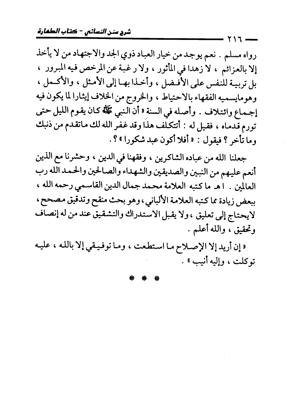 جعلنا الله من عباده الشاكرين، وفقهنا في الدين، وحشرنا مع الذين أنعم عليهم من النبين والصديقين والشهداء والصالحين والحمد الله رب العالمين. اهـ ما كتبه العلامة محمَّد جمال الدين القاسمي رحمه الله،