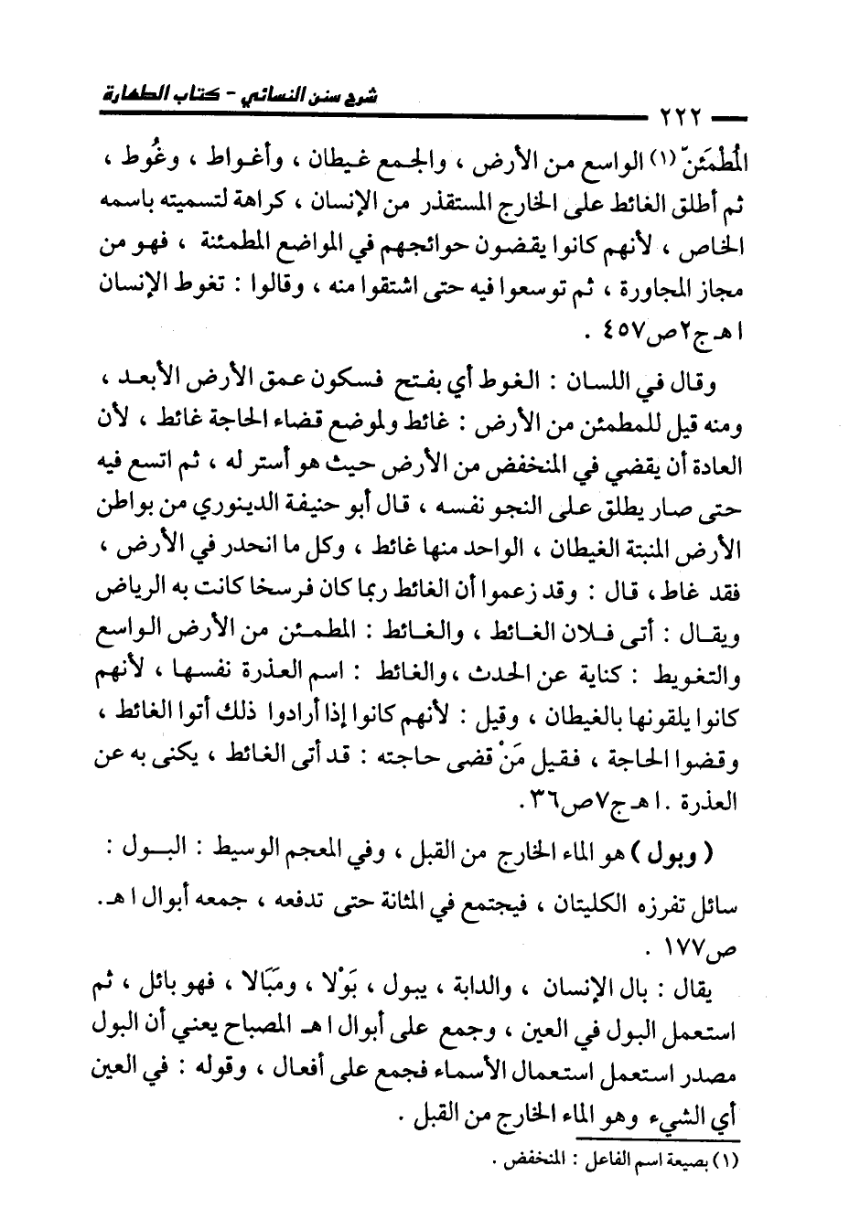 المُطمَئنّ (¬1) الواسع من الأرض، والجمع غيطان، وأغواط، وغُوط، ثم أطلق الغائط على الخارج المستقذر من الإنسان، كراهة لتسميته باسمه الخاص؛ لأنهم كانوا يقضون حوائجهم في المواضع المطمئنة، فهو من مجاز المجاورة، ثم توسعوا فيه حتى اشتقوا منه، وقالوا: تغوط الإنسان اهـ. ج 2 ص 457.