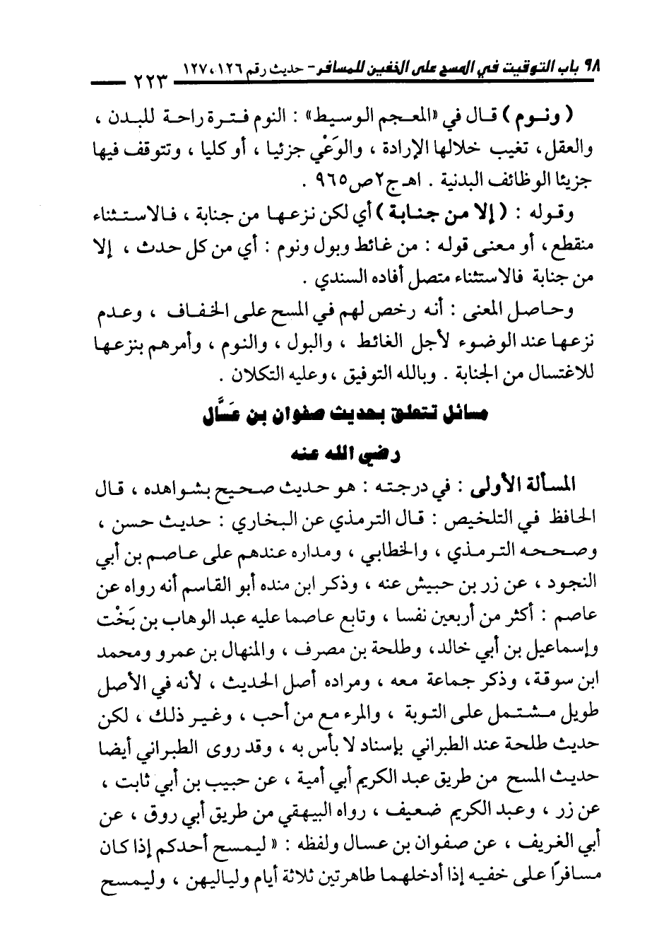 المسألة الأولى: في درجته: هو حديث صحيح بشواهده، قال الحافظ في التلخيص: قال الترمذي عن البخاري: حديث حسن، وصححه الترمذي، والخطابي، ومداره عندهم على عاصم بن أبي النجود، عن زر بن حبيش عنه، وذكر ابن منده أبو القاسم أنه رواه عن عاصم: أكثر من أربعين نفسا، وتابع عاصما عليه عبد الوهاب بن بَخْت وإسماعيل بن أبي خالد، وطلحة بن مصرف، والمنهال بن عمرو ومحمد ابن سوقة، وذكر جماعة معه، ومراده أصل الحديث؛ لأنه في الأصل طويل مشتمل على التوبة، والمرء مع من أحب، وغير ذلك، لكن حديث طلحة عند الطبراني بإسناد لا بأس به، وقد روى الطبراني أيضا حديث المسح من طريق عبد الكريم أبي أمية، عن حبيب بن أبي ثابت، عن زر، وعبد الكريم ضعيف، رواه البيهقي من طريق أبي روق، عن أبي الغريف، عن صفوان بن عسال ولفظه: "ليمسح أحدكم إذا كان مسافرًا على خفيه إذا أدخلهما طاهرتين ثلاثة أيام ولياليهن، وليمسح