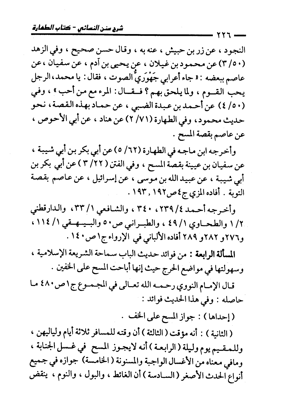 (الثانية): أنه مؤقت (الثالثة) أن وقته للمسافر ثلاثة أيام ولياليهن، وللمقيم يوم وليلة (الرابعة) أنه لا يجوز المسح في غسل الجنابة، وما في معناه من الأغسال الواجبة والمسنونة (الخامسة) جوازه في جميع أنواع الحدث الأصغر (السادسة) أن الغائط، والبول، والنوم، ينقض