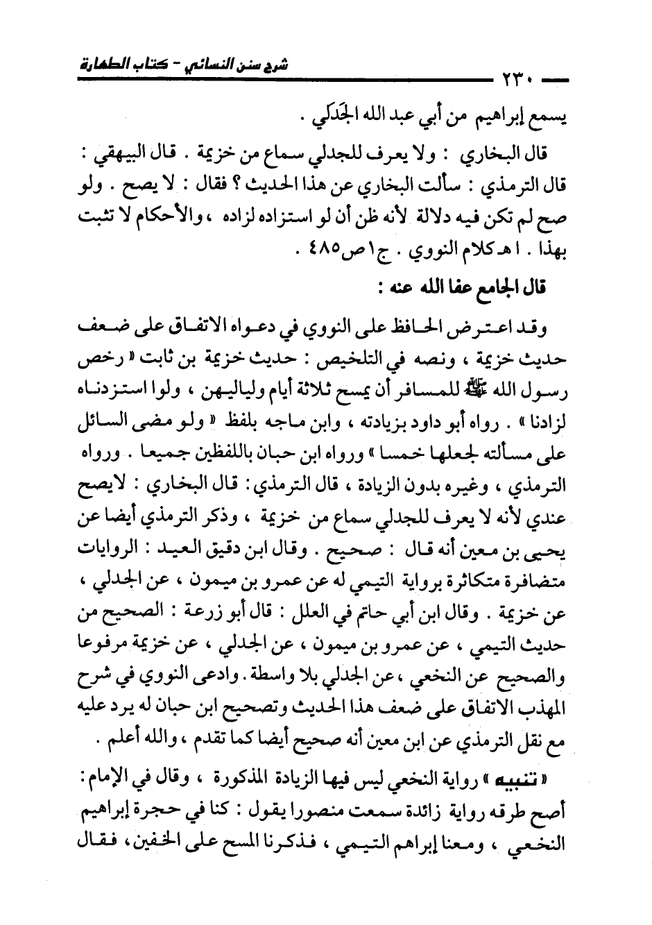وقد اعترض الحافظ على النووي في دعواه الاتفاق على ضعف حديث خزيمة، ونصه في التلخيص: حديث خزيمة بن ثابت "رخص رسول الله - صلى الله عليه وسلم - للمسافر أن يمسح ثلاثة أيام ولياليهن، ولوا استزدناه لزادنا". رواه أبو داود بزيادته، وابن ماجه بلفظ "ولو مضى السائل على مسألته لجعلها خمسا" ورواه ابن حبان باللفظين جميعا. ورواه الترمذي، وغيره بدون الزيادة، قال الترمذي: قال البخاري: لا يصح عندي لأنه لا يعرف للجدلي سماع من خزيمة، وذكر الترمذي أيضا عن يحيى بن معين أنه قال: صحيح. وقال ابن دقيق العيد: الروايات متضافرة متكاثرة برواية التيمي له عن عمرو بن ميمون، عن الجدلي، عن خزيمة. وقال ابن أبي حاتم في العلل: قال أبو زرعة: الصحيح من حديث التيمي، عن عمرو بن ميمون، عن الجدلي، عن خزيمة مرفوعا والصحيح عن النخعي، عن الجدلي بلا واسطة. وادعى النووي في شرح المهذب الاتفاق على ضعف هذا الحديث وتصحيح ابن حبان له يرد عليه مع نقل الترمذي عن ابن معين أنه صحيح أيضا كما تقدم، والله أعلم.