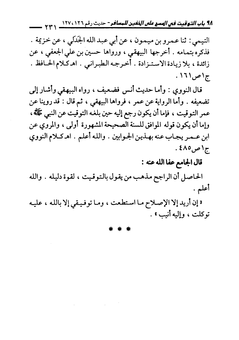 قال النووي: وأما حديث أنس فضعيف، رواه البيهقي وأشار إلى تضعيفه. وأما الرواية عن عمر، فرواها البيهقي، ثم قال: قد روينا عن عمر التوقيت، فإما أن يكون رجع إليه حين بلغه التوقيت عن النبي - صلى الله عليه وسلم -، وإما أن يكون قوله الموافق للسنة الصحيحة المشهورة أولى، والمروي عن ابن عمر يجاب عنه بهذين الجوابين. والله أعلم. اهـ كلام النووي ج 1 ص 485.