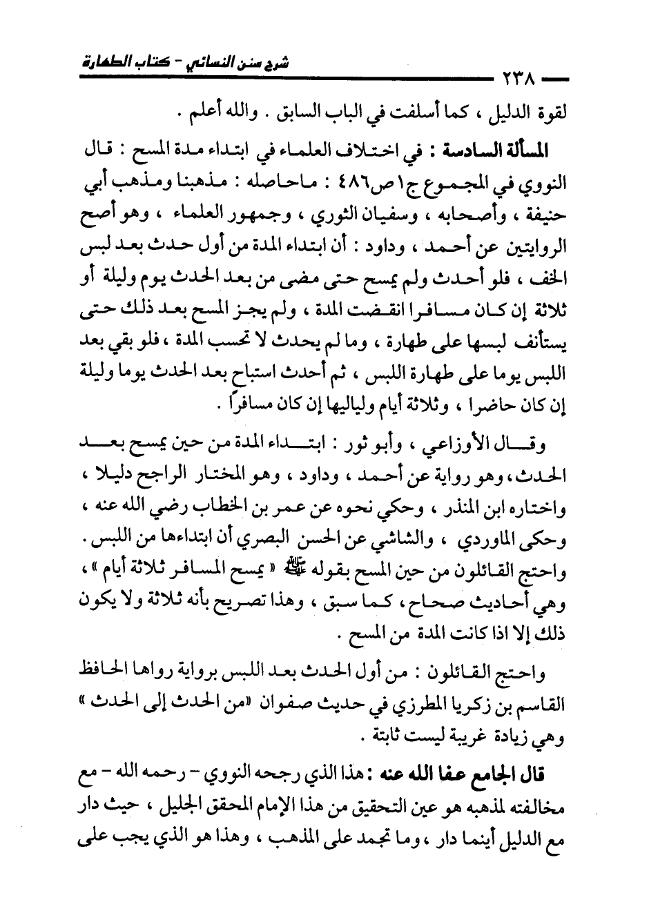 المسألة السادسة: في اختلاف العلماء في ابتداء مدة المسح: قال النووي في المجموع ج 1 ص 486: ماحاصله: مذهبنا ومذهب أبي حنيفة، وأصحابه، وسفيان الثوري، وجمهور العلماء، وهو أصح الروايتين عن أحمد، وداود: أن ابتداء المدة من أول حدث بعد لبس الخف، فلو أحدث ولم يمسح حتى مضى من بعد الحدث يوم وليلة أو ثلاثة إن كان مسافرا انقضت المدة، ولم يجز المسح بعد ذلك حتى