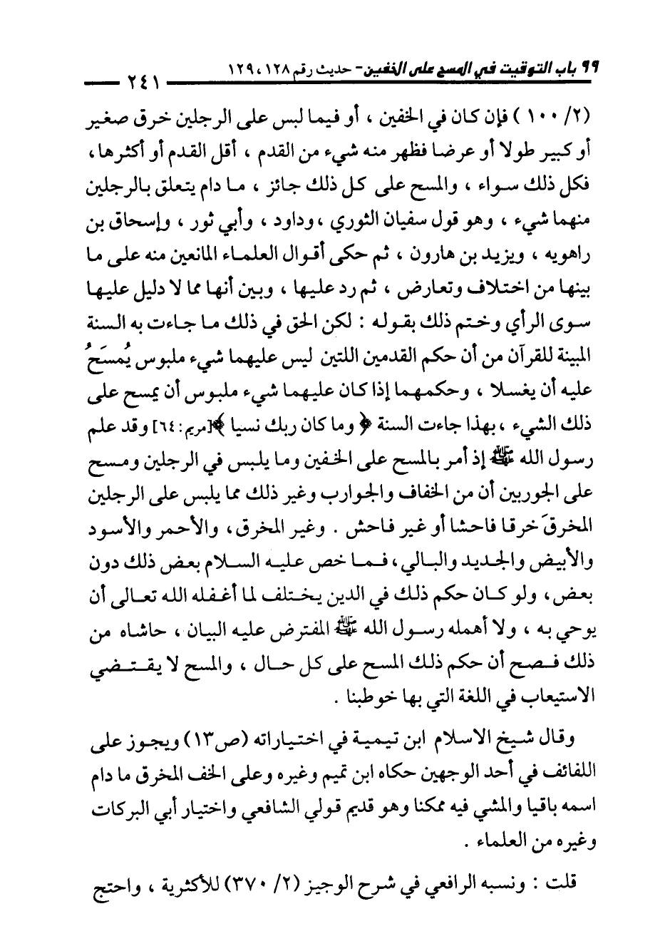 (2/ 100) فإن كان في الخفين، أو فيما لبس على الرجلين خرق صغير أو كبير طولا أو عرضا فظهر منه شيء من القدم، أقل القدم أو أكثرها، فكل ذلك سواء، والمسح على كل ذلك جائز، ما دام يتعلق بالرجلين منهما شيء، وهو قول سفيان الثوري، وداود، وأبي ثور، وإسحاق بن راهويه، ويزيد بن هارون، ثم حكى أقوال العلماء المانعين منه على ما بينها من اختلاف وتعارض، ثم رد عليها، وبين أنها مما لا دليل عليها سوى الرأي وختم ذلك بقوله: لكن الحق في ذلك ما جاءت به السنة المبينة للقرآن من أن حكم القدمين اللتين ليس عليهما شيء ملبوس يُمسَحُ عليه أن يغسلا، وحكمهما إذا كان عليهما شيء ملبوس أن يمسح على ذلك الشيء، بهذا جاءت السنة {وَمَا كَانَ رَبُّكَ نَسِيًّا} [مريم: 64] وقد علم رسول الله - صلى الله عليه وسلم - إذ أمر بالمسح على الخفين وما يلبس في الرجلين ومسح على الجوربين أن من الخفاف والجوارب وغير ذلك مما يلبس على الرجلين المخرقَ خرقا فاحشا أو غير فاحش. وغير المخرق، والأحمر والأسود والأبيض والجديد والبالي، فما خص عليه السلام بعض ذلك دون بعض، ولو كان حكم ذلك في الدين يختلف لما أغفله الله تعالى أن يوحي به، ولا أهمله رسول الله - صلى الله عليه وسلم - المفترض عليه البيان، حاشاه من ذلك فصح أن حكم ذلك المسح على كل حال، والمسح لا يقتضي الاستيعاب في اللغة التي بها خوطبنا.