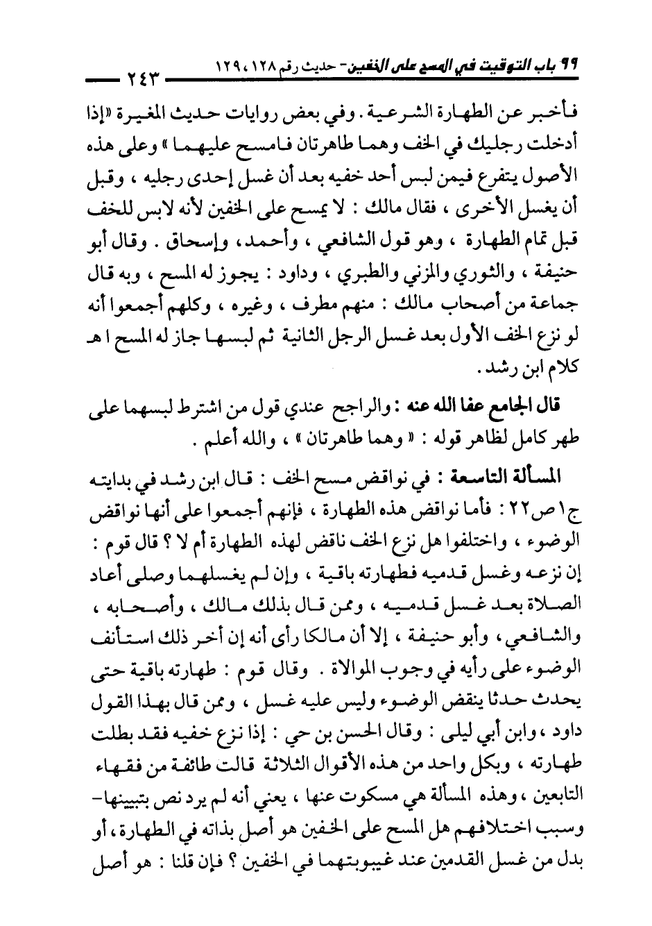 فأخبر عن الطهارة الشرعية. وفي بعض روايات حديث المغيرة "إذا أدخلت رجليك في الخف وهما طاهرتان فامسح عليهما" وعلى هذه الأصول يتفرع فيمن لبس أحد خفيه بعد أن غسل إحدى رجليه، وقبل أن يغسل الأخرى، فقال مالك: لا يمسح على الخفين لأنه لابس للخف قبل تمام الطهارة، وهو قول الشافعي، وأحمد، وإسحاق. وقال أبو حنيفة، والثوري والمزني والطبري، وداود: يجوز له المسح، وبه قال جماعة من أصحاب مالك: منهم مطرف، وغيره، وكلهم أجمعوا أنه لو نزع الخف الأول بعد غسل الرجل الثانية ثم لبسها جاز له المسح اهـ كلام ابن رشد.