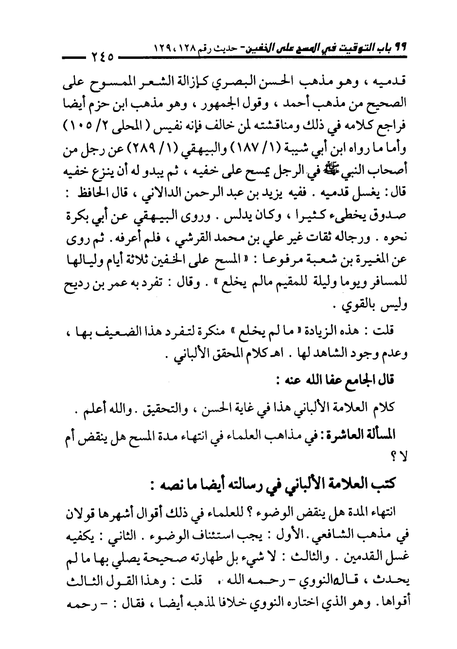 قدميه، وهو مذهب الحسن البصري كإزالة الشعر الممسوح على الصحيح من مذهب أحمد، وقول الجمهور، وهو مذهب ابن حزم أيضا فراجع كلامه في ذلك ومناقشته لمن خالف فإنه نفيس (المحلى 2/ 105) وأما ما رواه ابن أبي شيبة (1/ 187) والبيهقي (1/ 289) عن رجل من أصحاب النبي - صلى الله عليه وسلم - في- الرجل يمسح على خفيه، ثم يبدو له أن ينزع خفيه قال: يغسل قدميه. ففيه يزيد بن عبد الرحمن الدالاني، قال الحافظ: صدوق يخطئ كثيرا، وكان يدلس. وروى البيهقي عن أبي بكرة نحوه. ورجاله ثقات غير علي بن محمَّد القرشي، فلم أعرفه. ثم روى عن المغيرة بن شعبة مرفوعا: "المسح على الخفين ثلاثة أيام وليالها للمسافر ويوما وليلة للمقيم ما لم يخلع". وقال: تفرد به عمر بن رديح وليس بالقوي.