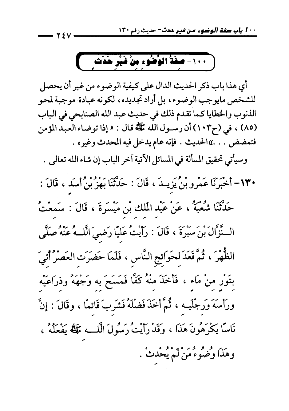 130 - أَخْبَرَنَا عَمْرُو بْنُ يَزِيدَ، قَالَ: حَدَّثَنَا بَهْزُ بْنُ أَسَدٍ، قَالَ: حَدَّثَنَا شُعْبَةُ، عَنْ عَبْدِ الْمَلِكِ بْنِ مَيْسَرَةَ، قَالَ: سَمِعْتُ النَّزَّالَ بْنَ سَبْرَةَ، قَالَ: رَأَيْتُ عَلِيًّا رَضِيَ اللهُ عَنْهُ صَلَّى الظُّهْرَ، ثُمَّ قَعَدَ لِحَوَائِجِ النَّاسِ، فَلَمَّا حَضَرَتِ الْعَصْرُ أُتِيَ بِتَوْرٍ مِنْ مَاءٍ، فَأَخَذَ مِنْهُ كَفًّا فَمَسَحَ بِهِ وَجْهَهُ وَذِرَاعَيْهِ وَرَأْسَهُ وَرِجْلَيْهِ، ثُمَّ أَخَذَ فَضْلَهُ فَشَرِبَ قَائِمًا، وَقَالَ: إِنَّ نَاسًا يَكْرَهُونَ هَذَا، وَقَدْ رَأَيْتُ رَسُولَ اللهِ - صلى الله عليه وسلم - يَفْعَلُهُ وَهَذَا وُضُوءُ مَنْ لَمْ يُحْدِثْ.