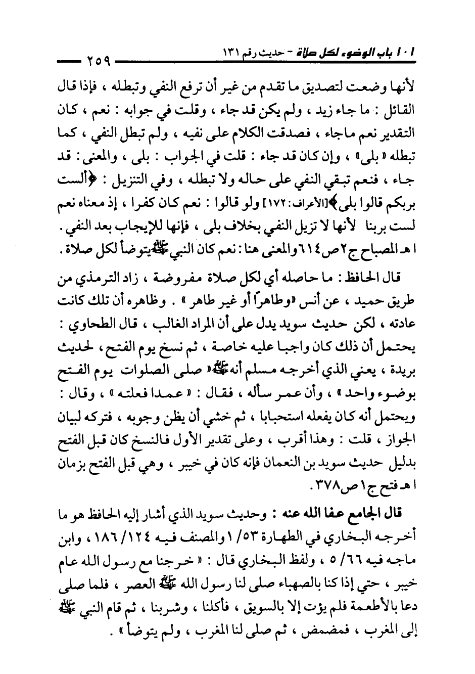 قال الحافظ: ما حاصله أي لكل صلاة مفروضة، زاد الترمذي من طريق حميد، عن أنس "وطاهرًا أو غير طاهر". وظاهره أن تلك كانت عادته، لكن حديث سويد يدل على أن المراد الغالب، قال الطحاوي: يحتمل أن ذلك كان واجبا عليه خاصة، ثم نسخ يوم الفتح، لحديث بريدة، يعني الذي أخرجه مسلم أنه - صلى الله عليه وسلم - "صلى الصلوات يوم الفتح بوضوء واحد"، وأن عمر سأله، فقال: "عمدا فعلته"، وقال: ويحتمل أنه كان يفعله استحبابا، ثم خشي أن يظن وجوبه، فتركه لبيان الجواز، قلت: وهذا أقرب، وعلى تقدير الأول فالنسخ كان قبل الفتح بدليل حديث سويد بن النعمان فإنه كان في خيبر، وهي قبل الفتح بزمان اهـ فتح ج 1 ص 378.