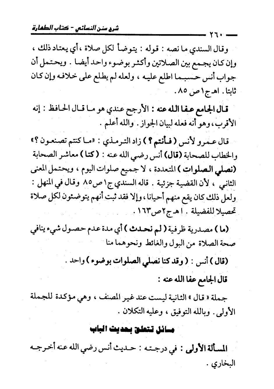 وقال السندي ما نصه: قوله: يتوضأ لكل صلاة، أي يعتاد ذلك، وإن كان يجمع بين الصلاتين وأكثر بوضوء واحد أيضا. ويحتمل أن جواب أنس حسبما اطلع عليه، ولعله لم يطلع على خلافه وإن كان