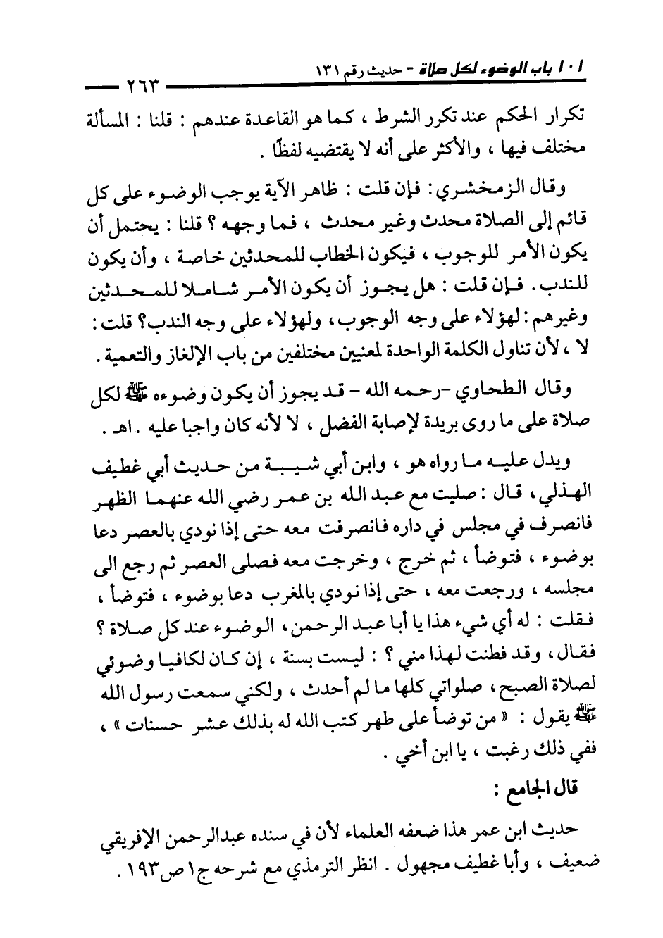 حديث ابن عمر هذا ضعفه العلماء لأن في سنده عبد الرحمن الإفريقي ضعيف، وأبا غطيف مجهول. انظر الترمذي مع شرحه جـ 1 ص 193.