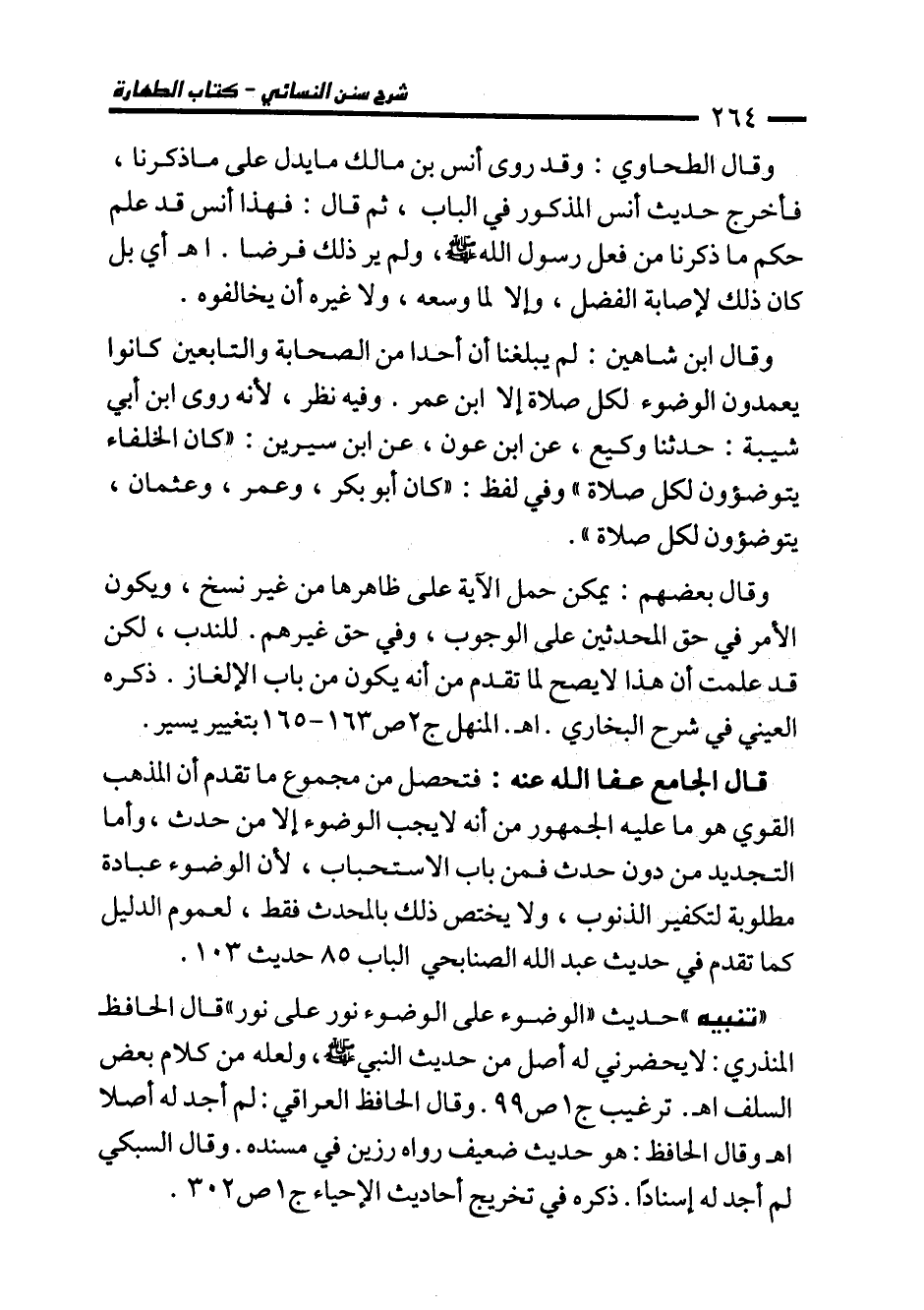 "تنبيه" حديث "الوضوء على الوضوء نور على نور" قال الحافظ المنذري: لا يحضرني له أصل من حديث النبي - صلى الله عليه وسلم -، ولعله من كلام بعض السلف اهـ. ترغيب ج 1 ص 99. وقال الحافظ العراقي: لم أجد له أصلا اهـ وقال الحافظ: هو حديث ضعيف رواه رزين في مسنده. وقال السبكي لم أجد له إسنادًا. ذكره في تخريج أحاديث الإحياء ج 1 ص 302.