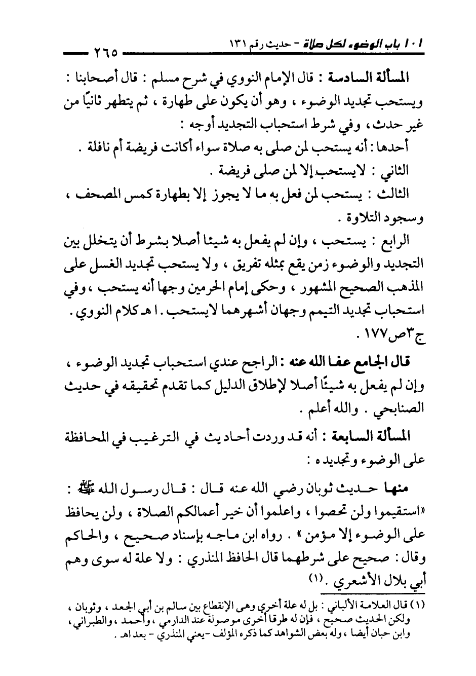 المسألة السادسة: قال الإمام النووي في شرح مسلم: قال أصحابنا: ويستحب تجديد الوضوء، وهو أن يكون على طهارة، ثم يتطهر ثانيًا من غير حدث، وفي شرط استحباب التجديد أوجه: