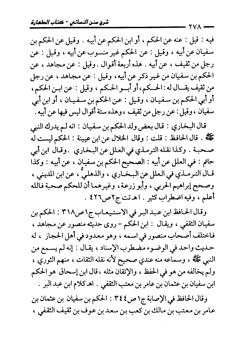 وقال الحافظ ابن عبد البر في الاستيعاب ج 1 ع 318: الحكم بن سفيان الثقفي، ويقال: ابن الحكم- روى حديثه منصور عن مجاهد، فاختلف أصحاب منصور في اسمه، وهو معدود في أهل الحجاز، له حديث واحد في الوضوء مضطرب الإسناد، يقال: إنه لم يسمع من النبي - صلى الله عليه وسلم -، وسماعه منه عندي صحيح لأنه نقله الثقات، منهم الثوري، ولم يخالفه من هو في الحفظ، والإتقان مثله، قال ابن إسحاق هو الحكم ابن سفيان بن عثمان بن عامر بن معتب الثقفي. اهـ كلام ابن عبد البر.