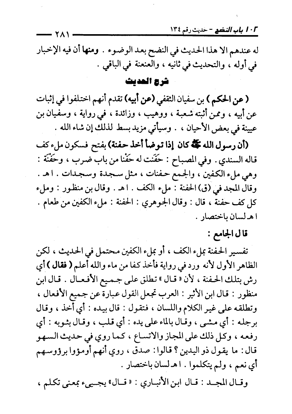 (أن رسول الله - صلى الله عليه وسلم - كان إذا توضأ أخذ حفنة) بفتح فسكون ملء كف قاله السندي. وفي المصباح: حَفَنت له حَفْنا من باب ضرب، وحَفْنَة: وهي ملء الكفين، والجمع حفنات، مثل سجدة وسجدات. اهـ. وقال المجد في (ق) الحفنة: ملء الكف. اهـ. وقال بن منظور: وملء كل كف حفنة، قال: وقال الجوهري: الحفنة: ملء الكفين من طعام. اهـ لسان باختصار.