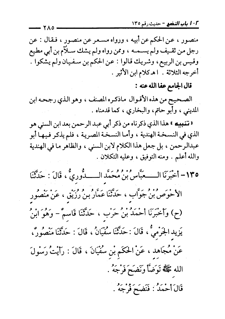 136 - أَخْبَرَنَا الْعَبَّاسُ بْنُ مُحَمَّدٍ الدُّورِيُّ، قَالَ: حَدَّثَنَا الأَحْوَصُ بْنُ جَوَّابٍ، حَدَّثَنَا عَمَّارُ بْنُ رُزَيْقٍ، عَنْ مَنْصُورٍ (ح) وَأَخْبَرَنَا أَحْمَدُ بْنُ حَرْبٍ، حَدَّثَنَا قَاسِمٌ - وَهُوَ ابْنُ يَزِيدَ الْجَرْمِيُّ، قَالَ: حَدَّثَنَا سُفْيَانُ، قَالَ: حَدَّثَنَا مَنْصُورٌ، عَنْ مُجَاهِدٍ، عَنِ الْحَكَمِ بْنِ سُفْيَانَ، قَالَ: رَأَيْتُ رَسُولَ اللهِ - صلى الله عليه وسلم - تَوَضَّأَ وَنَضَحَ فَرْجَهُ.