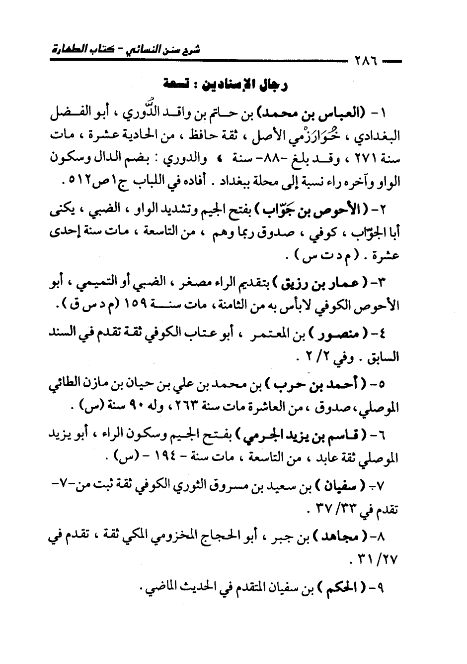 1 - (العباس بن محمَّد) بن حاتم بن واقد الدوري، أبو الفضل البغدادي، خواززمي الأصل، ثقة حافظ، من الحادية عشرة، مات سنة 271، وقد بلغ -88 - سنة، والدوري: بضم الدال وسكون الواو وآخره راء نسبة إلى محلة ببغداد. أفاده في اللباب ج 1 ص 512.