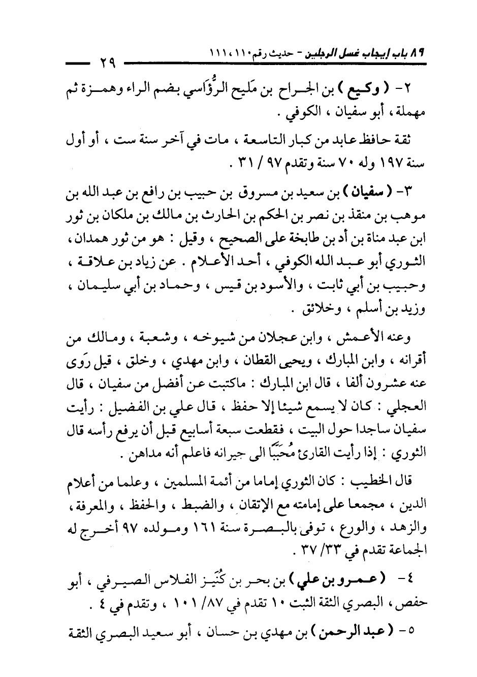 3 - (سفيان) بن سعيد بن مسروق بن حبيب بن رافع بن عبد الله بن موهب بن منقذ بن نصر بن الحكم بن الحارث بن مالك بن ملكان بن ثور ابن عبد مناة بن أد بن طابخة على الصحيح، وقيل: هو من ثور همدان، الثوري أبو عبد الله الكوفي، أحد الأعلام. عن زياد بن علاقة، وحبيب بن أبي ثابت، والأسود بن قيس، وحماد بن أبي سليمان، وزيد بن أسلم، وخلائق.