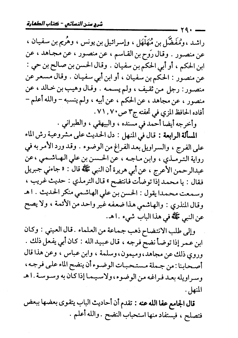 المسألة الرابعة: قال في المنهل: دل الحديث على مشروعية رش الماء على الفرج، والسراويل بعد الفراغ من الوضوء. وقد ورد الأمر به في رواية الترمذي، وابن ماجه، عن الحسن بن علي الهاشمي، عن عبد الرحمن الأعرج، عن أبي هريرة أن النبي - صلى الله عليه وسلم - قال: "جاءني جبريل فقال: يا محمَّد إذا توضأت فانتضح" قال الترمذي: حديث غريب، وسمعت محمدا يقول: الحسن بن علي الهاشمي منكر الحديث. اهـ وقال المنذري: والهاشمي هذا ضعفه غير واحد من الأئمة، ولا يصح عن النبي - صلى الله عليه وسلم - في هذا الباب شيء. اهـ.