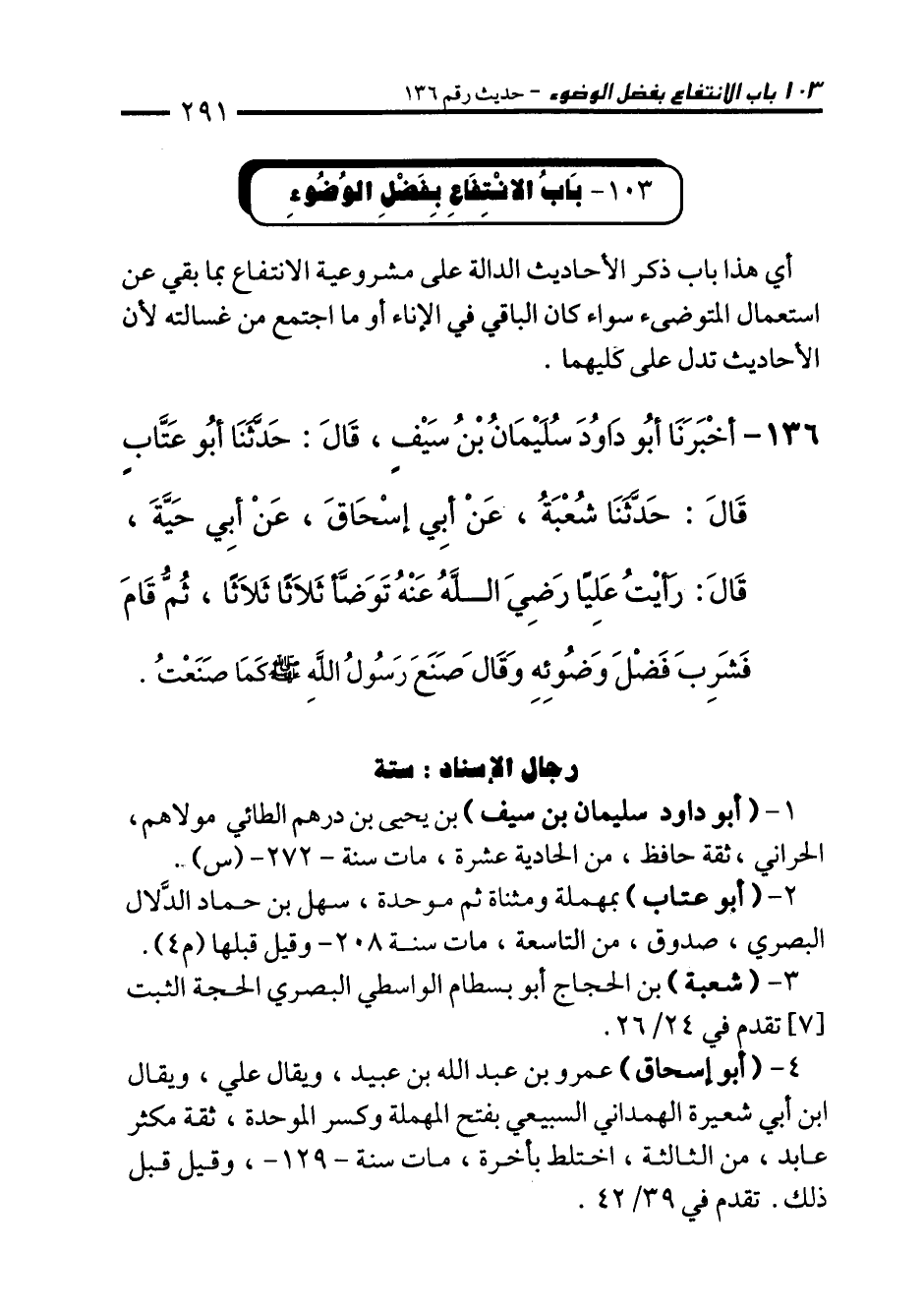 136 - أَخْبَرَنَا أَبُو دَاوُدَ سُلَيْمَانُ بْنُ سَيْفٍ، قَالَ: حَدَّثَنَا أَبُو عَتَّابٍ قَالَ: حَدَّثَنَا شُعْبَةُ، عَنْ أَبِي إِسْحَاقَ، عَنْ أَبِي حَيَّةَ، قَالَ: رَأَيْتُ عَلِيًّا رَضِيَ اللهُ عَنْهُ تَوَضَّأَ ثَلاَثًا ثَلاَثًا، ثُمَّ قَامَ فَشَرِبَ فَضْلَ وَضُوئِهِ وَقَالَ صَنَعَ رَسُولُ اللهِ - صلى الله عليه وسلم - كَمَا صَنَعْتُ.