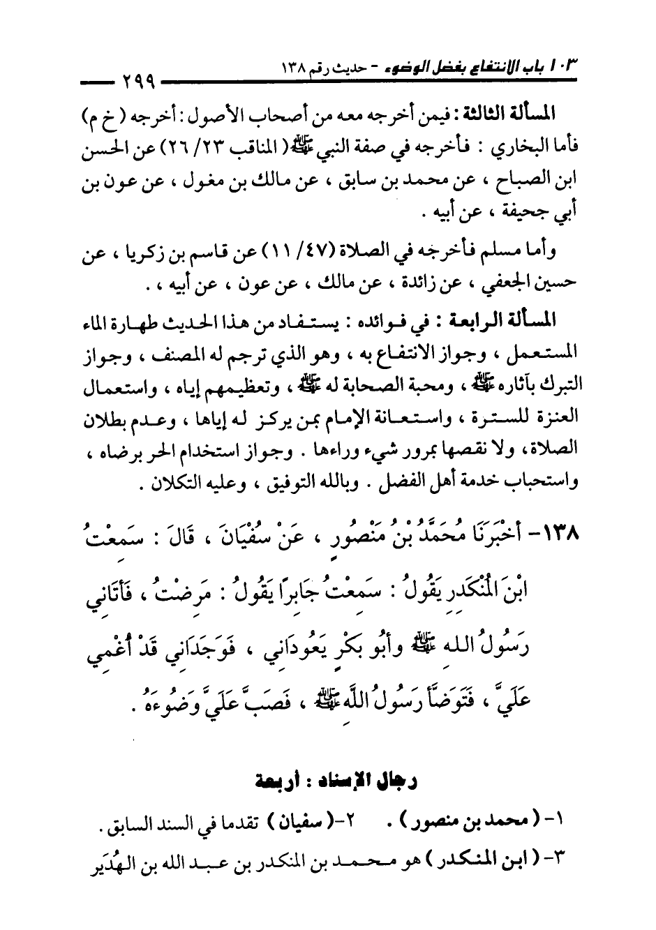 138 - أَخْبَرَنَا مُحَمَّدُ بْنُ مَنْصُورٍ، عَنْ سُفْيَانَ، قَالَ: سَمِعْتُ ابْنَ الْمُنْكَدِرِ يَقُولُ: سَمِعْتُ جَابِرًا يَقُولُ: مَرِضْتُ، فَأَتَانِي رَسُولُ اللهِ - صلى الله عليه وسلم - وَأَبُو بَكْرٍ يَعُودَانِّي، فَوَجَدَانِي قَدْ أُغْمِي عَلَيَّ، فَتَوَضَّأَ رَسُولُ اللهِ - صلى الله عليه وسلم -، فَصَبَّ عَلَيَّ وَضُوءَهُ.