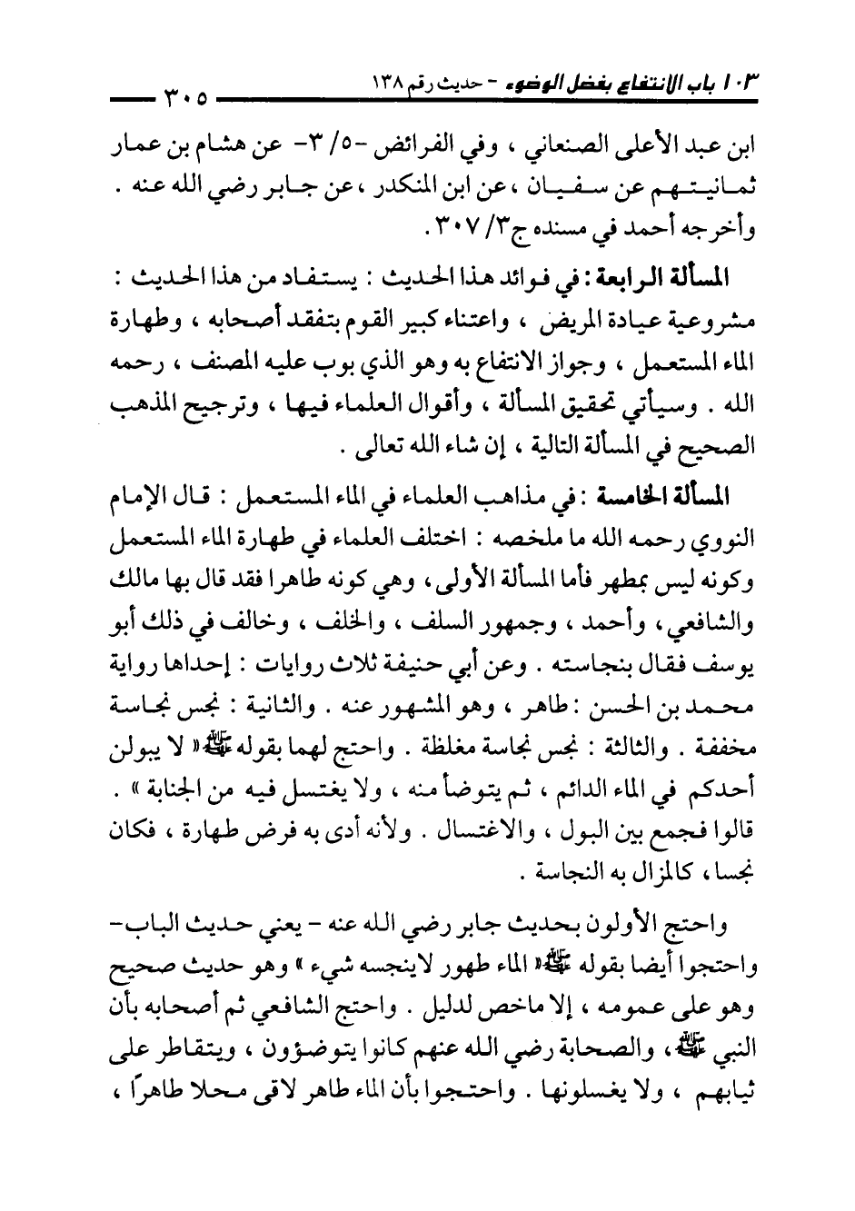 المسألة الخامسة: في مذاهب العلماء في الماء المستعمل: قال الإمام النووي رحمه الله ما ملخصه: اختلف العلماء في طهارة الماء المستعمل وكونه ليس بمطهر فأما المسألة الأولى، وهي كونه طاهرا فقد قال بها مالك والشافعي، وأحمد، وجمهور السلف، والخلف، وخالف في ذلك أبو يوسف فقال بنجاسته. وعن أبي حنيفة ثلاث روايات: إحداها رواية محمَّد بن الحسن: طاهر، وهو المشهور عنه. والثانية: نجس نجاسة مخففة. والثالثة: نجس نجاسة مغلظة. واحتج لهما بقوله - صلى الله عليه وسلم - "لا يبولن