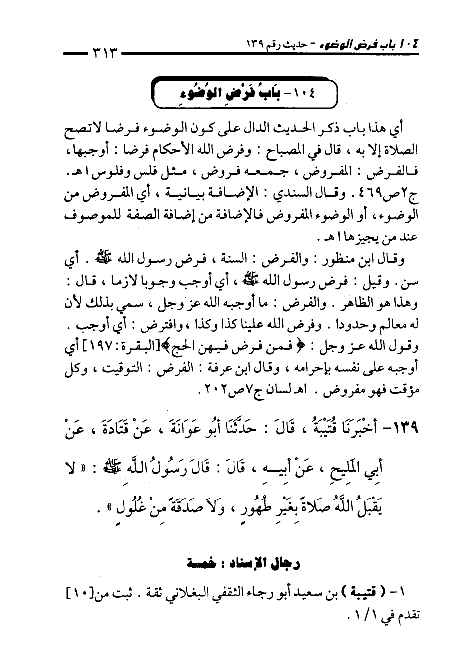 139 - أَخْبَرَنَا قُتَيْبَةُ، قَالَ: حَدَّثَنَا أَبُو عَوَانَةَ، عَنْ قَتَادَةَ، عَنْ أَبِي الْمَلِيحِ، عَنْ أَبِيهِ، قَالَ: قَالَ رَسُولُ اللهِ - صلى الله عليه وسلم -: "لاَ يَقْبَلُ اللهُ صَلاَةً بِغَيْرِ طُهُورٍ، وَلاَ صَدَقَةً مِنْ غُلُولٍ".