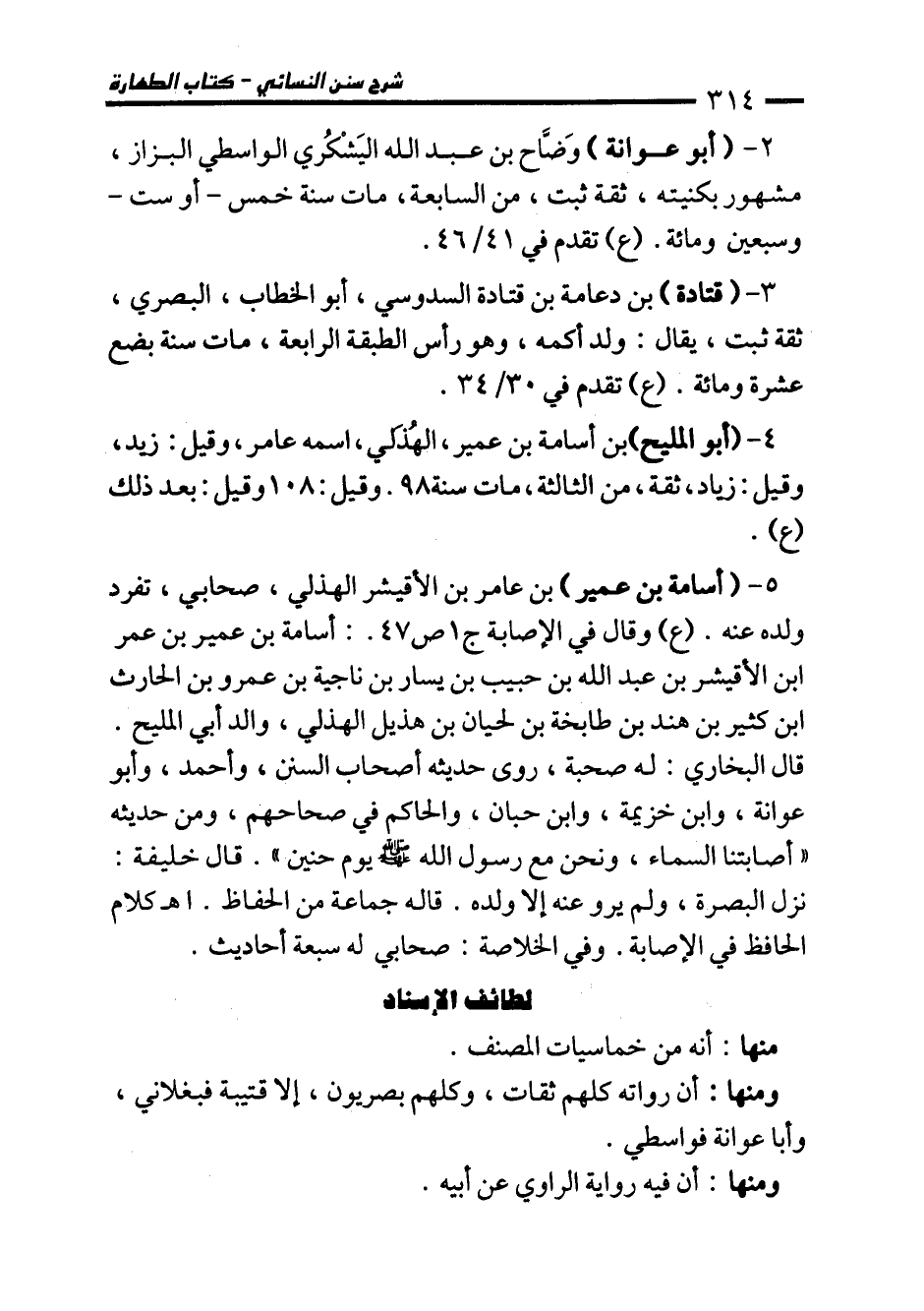 5 - (أسامة بن عمير) بن عامر بن الأقيشر الهذلي، صحابي، تفرد ولده عنه. (ع) وقال في الإصابة ج 1 ص 47.: أسامة بن عمير بن عمر ابن الأقيشر بن عبد الله بن حبيب بن يسار بن ناجية بن عمرو بن الحارث ابن كثير بن هند بن طابخة بن لحيان بن هذيل الهذلي، والد أبي المليح. قال البخاري: له صحبة، روى حديثه أصحاب السنن، وأحمد، وأبو عوانة، وابن خزيمة، وابن حبان، والحاكم في صحاحهم، ومن حديثه "أصابتنا السماء، ونحن مع رسول الله - صلى الله عليه وسلم - يوم حنين". قال خليفة: نزل البصرة، ولم يرو عنه إلا ولده. قاله جماعة من الحفاظ. اهـ كلام الحافظ في الإصابة. وفي الخلاصة: صحابي له سبعة أحاديث.