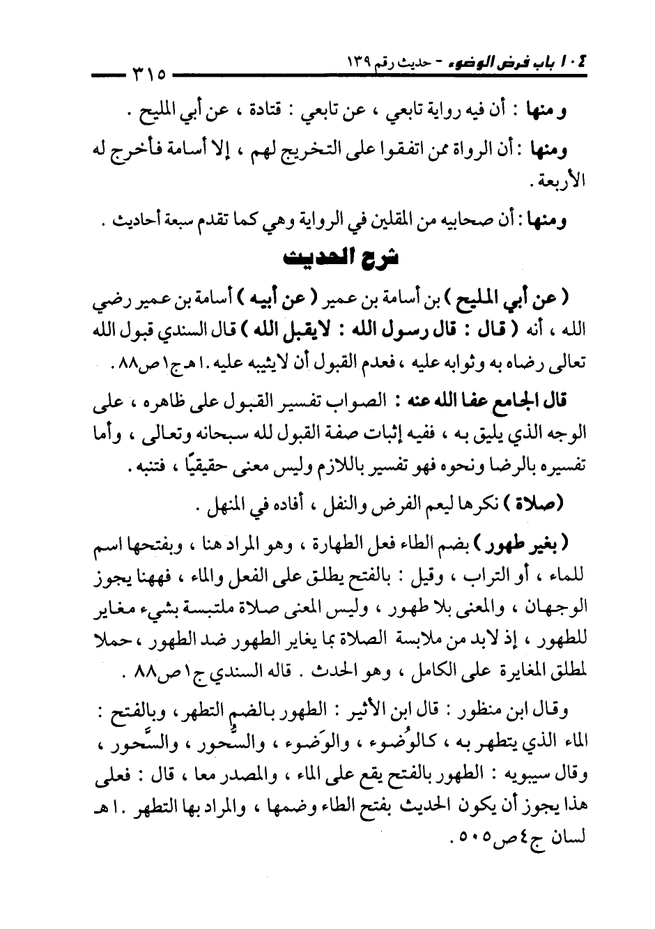 (عن أبي المليح) بن أسامة بن عمير (عن أبيه) أسامة بن عمير رضي الله، أنه (قال: قال رسول الله: لا يقبل الله) قال السندي قبول الله تعالى رضاه به وثوابه عليه، فعدم القبول أن لا يثيبه عليه. اهـ ج 1 ص 88.