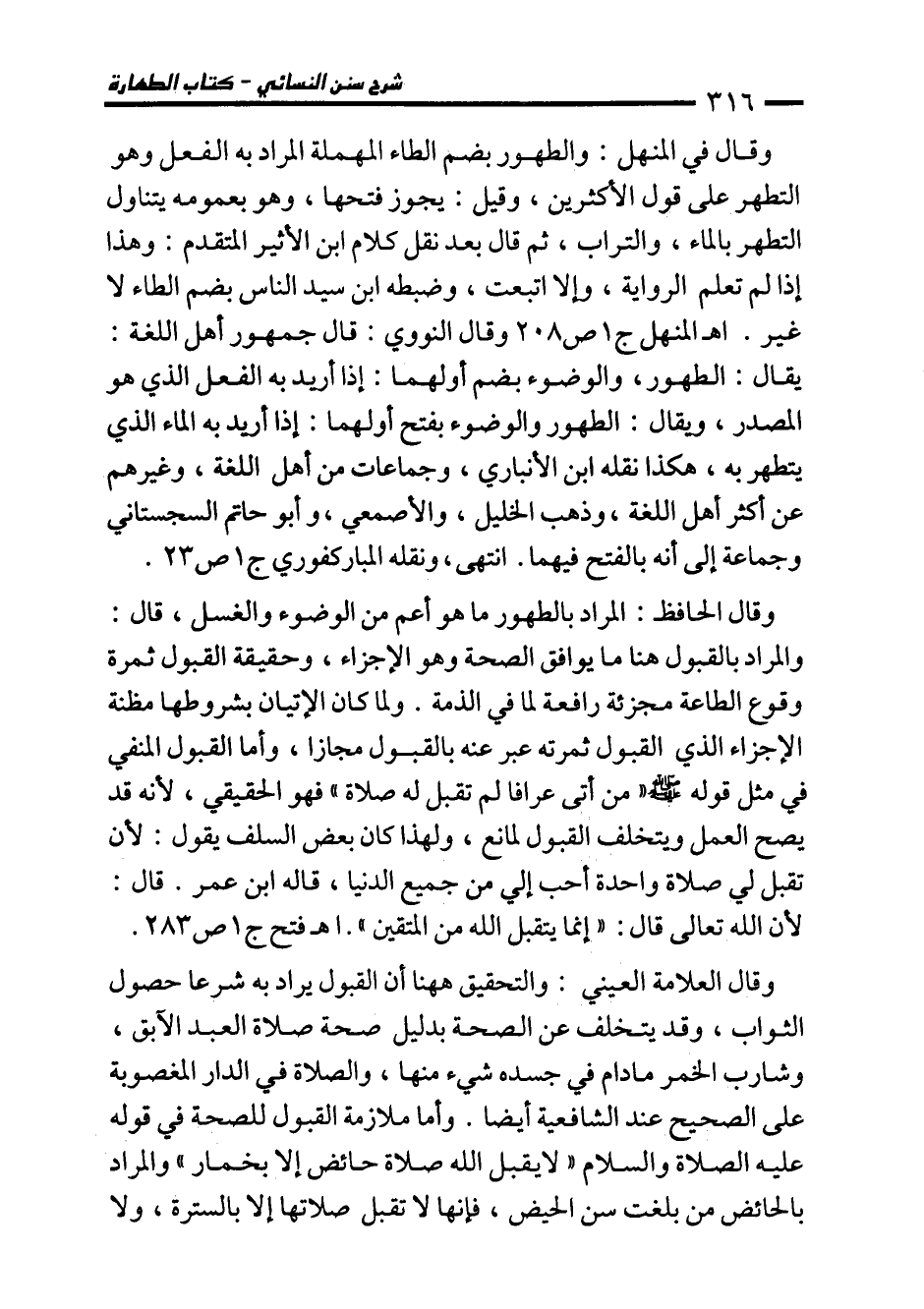 وقال في المنهل: والطهور بضم الطاء المهملة المراد به الفعل وهو التطهر على قول الأكثرين، وقيل: يجوز فتحها، وهو بعمومه يتناول التطهر بالماء، والتراب، ثم قال بعد نقل كلام ابن الأثير المتقدم: وهذا إذا لم تعلم الرواية، وإلا اتبعت، وضبطه ابن سيد الناس بضم الطاء لا غير. اهـ المنهل ج 1 ص 208 وقال النووي: قال جمهور أهل اللغة: يقال: الطهور، والوضوء بضم أولهما: إذا أريد به الفعل الذي هو المصدر، ويقال: الطهور والوضوء بفتح أولهما: إذا أريد به الماء الذي يتطهر به، هكذا نقله ابن الأنباري، وجماعات من أهل اللغة، وغيرهم عن أكثر أهل اللغة، وذهب الخليل، والأصمعي، وأبو حاتم السجستاني وجماعة إلى أنه بالفتح فيهما. انتهى، ونقله المباركفوري ج 1 ص 23.