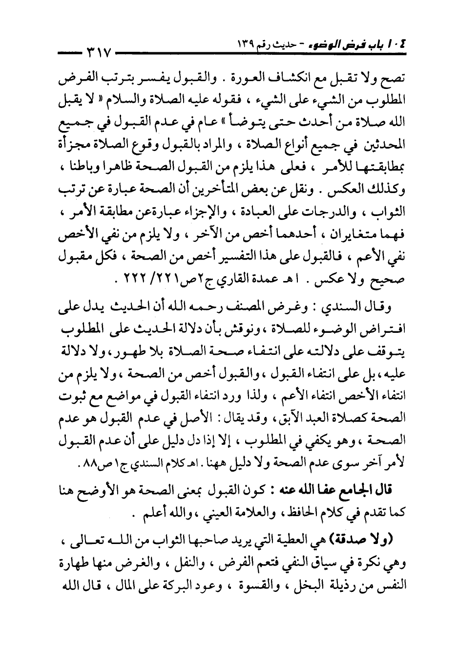 وقال السندي: وغرض المصنف رحمه الله أن الحديث يدل على افتراض الوضوء للصلاة، ونوقش بأن دلالة الحديث على المطلوب يتوقف على دلالته على انتفاء صحة الصلاة بلا طهور، ولا دلالة عليه، بل على انتفاء القبول، والقبول أخص من الصحة، ولا يلزم من انتفاء الأخص انتفاء الأعم، ولذا ورد انتفاء القبول في مواضع مع ثبوت الصحة كصلاة العبد الآبق، وقد يقال: الأصل في عدم القبول هو عدم الصحة، وهو يكفي في المطلوب، إلا إذا دل دليل على أن عدم القبول لأمر آخر سوى عدم الصحة ولا دليل ها هنا. اهـ كلام السندي ج 1 ص 88.