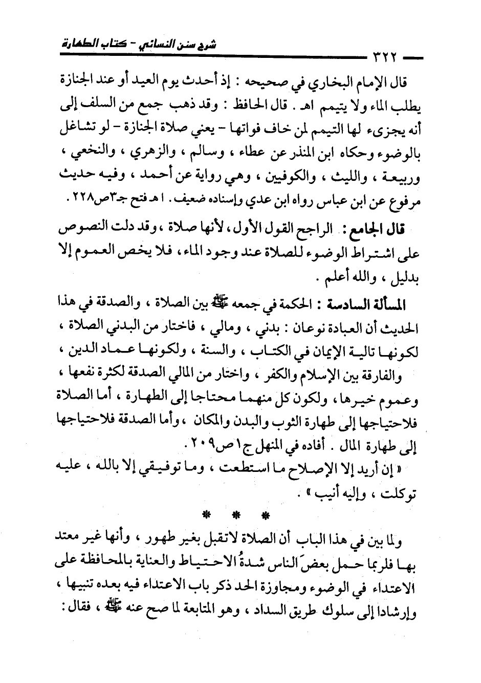 المسألة السادسة: الحكمة في جمعه - صلى الله عليه وسلم - بين الصلاة، والصدقة في هذا الحديث أن العبادة نوعان: بدني، ومالي، فاختار من البدني الصلاة، لكونها تالية الإيمان في الكتاب، والسنة، ولكونها عماد الدين، والفارقة بين الإسلام والكفر، واختار من المالي الصدقة لكثرة نفعها، وعموم خيرها، ولكون كل منهما محتاجا إلى الطهارة، أما الصلاة فلاحتياجها إلى طهارة الثوب والبدن والمكان، وأما الصدقة فلاحتياجها إلى طهارة المال. أفاده في المنهل ج 1 ص 209.