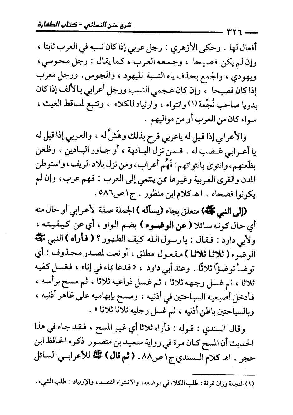وقال السندي: قوله: فأراه ثلاثا أي غير المسح، فقد جاء في هذا الحديث أن المسح كان مرة في رواية سعيد بن منصور ذكره الحافظ ابن حجر. اهـ كلام السندي ج 1 ص 88. (ثم قال) - صلى الله عليه وسلم - للأعرابي السائل